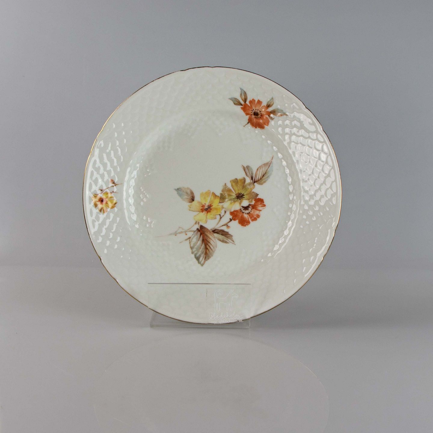Tallerken i cremefarvet porcelæn med skælmønster og guldkant med blomstermotiv.