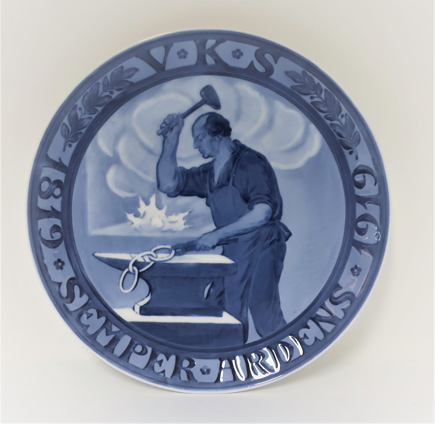 Royal Copenhagen. Memorial Plate # 189. Odd Fellow plate. Blacksmith who forges the three rings. 1919. Diameter 23 cm.