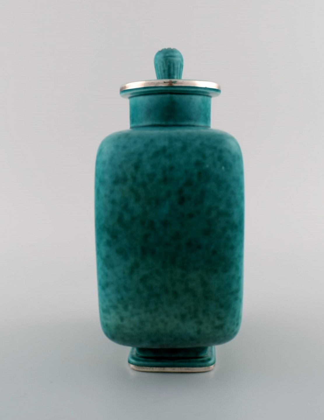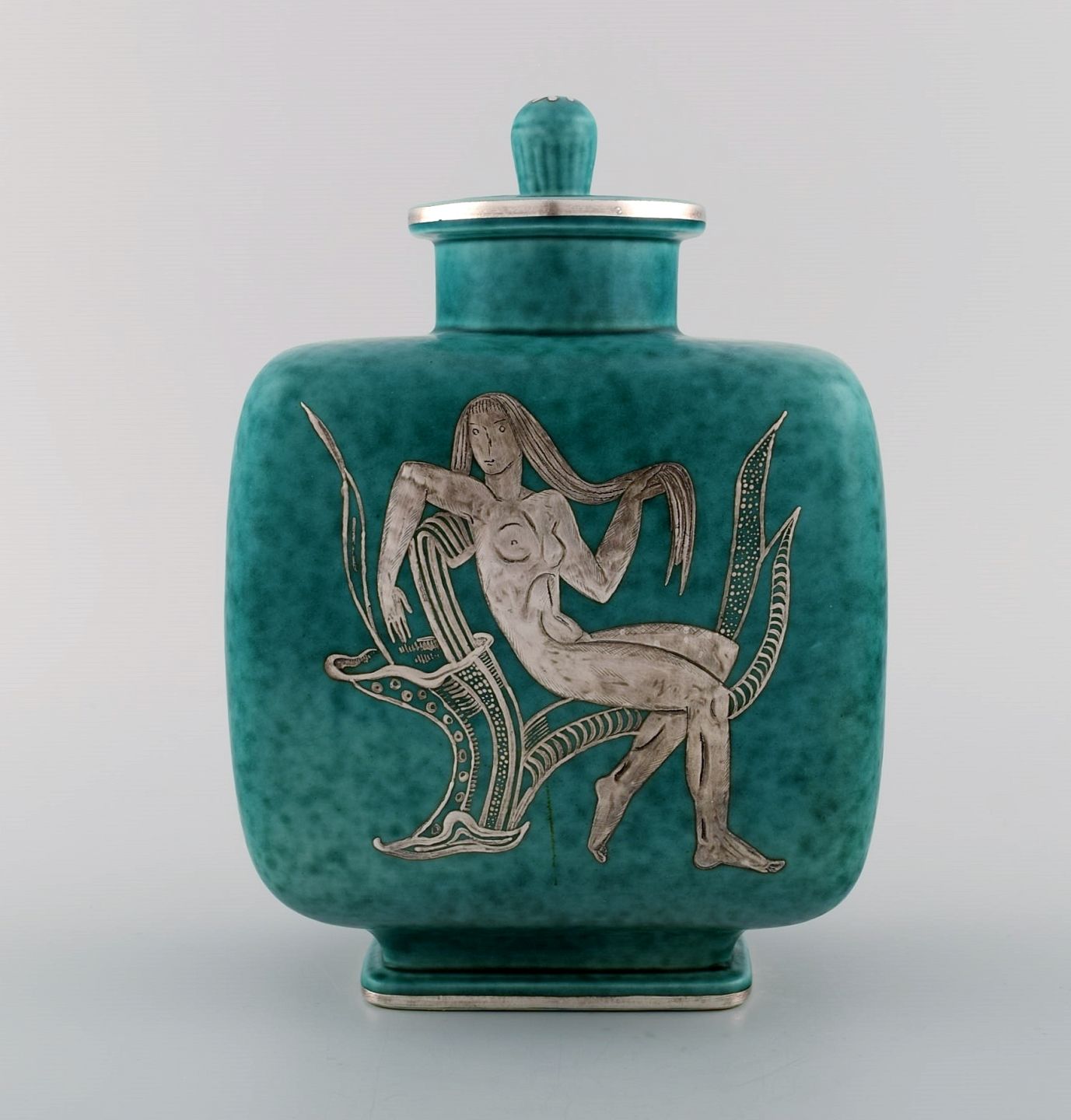 Wilhelm Kåge for Gustavsberg. Argenta art deco lågkrukke i glaseret keramik dekoreret med nøgen kvinde i sølvindlæg.