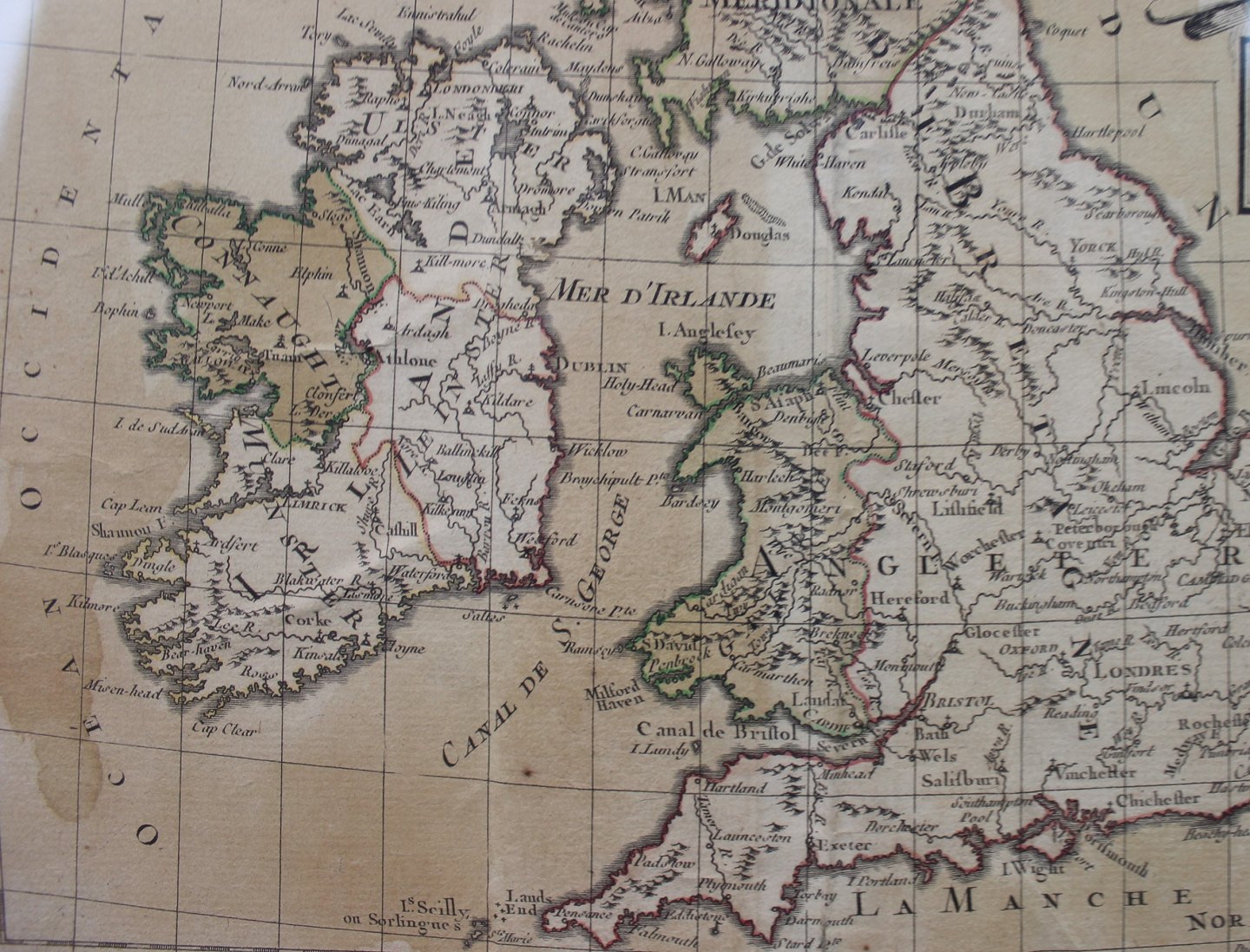 Fransk kort over de britiske øer i ny glasramme med sølv farvet kant.