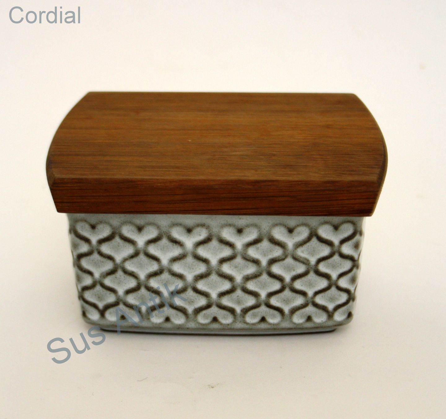 Nissen, Cordial, Smørboks med teaktræ låg. Højde 7 cm. Længde 13 cm. Bredde 10 cm. Pris: 350 kr. stk. Lager : 1