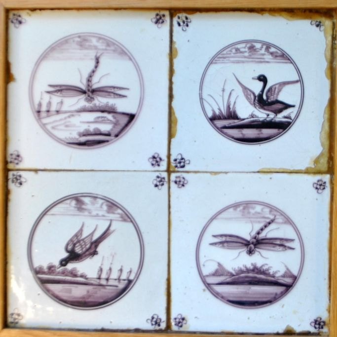 Firpas, animal tiles, manganese colored, 18th century Holland. Decorations with duck, dove and dragonflies. Corner ornamentation in the form of bees. 26 x 26 cm.