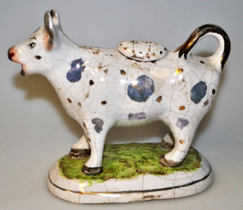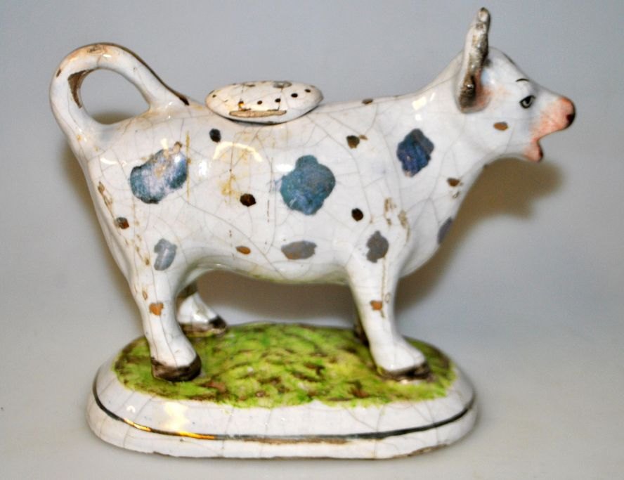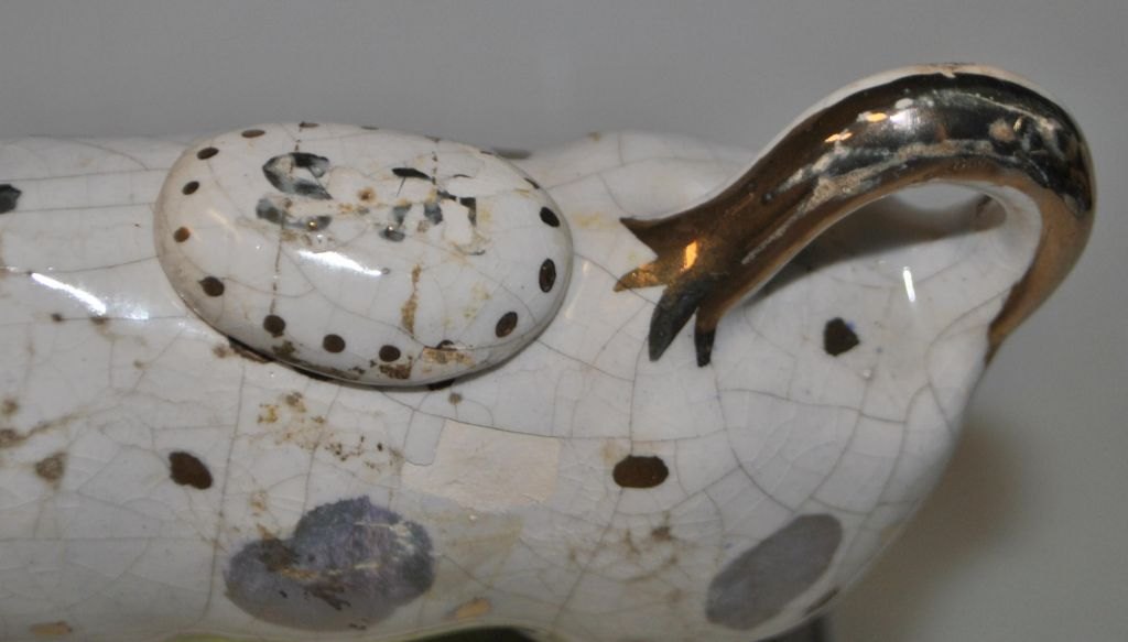 Fajance fløde ko, 19. årh. England. Hvidglaseret, med pletter i lustra og forgyldning. Fodplade bemalet i lysgrønt. Mindre låg med initialerne: S.M. Ustemplet. L.: 16,5 cm. Højde:. 14 cm.