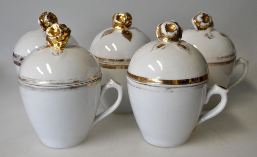 5 antique chocolate cups with lids, 19th century Germany. With gold decorations. With handle and lid with floral decorations. H .: 15 cm. Dia .: 9.5 cm.