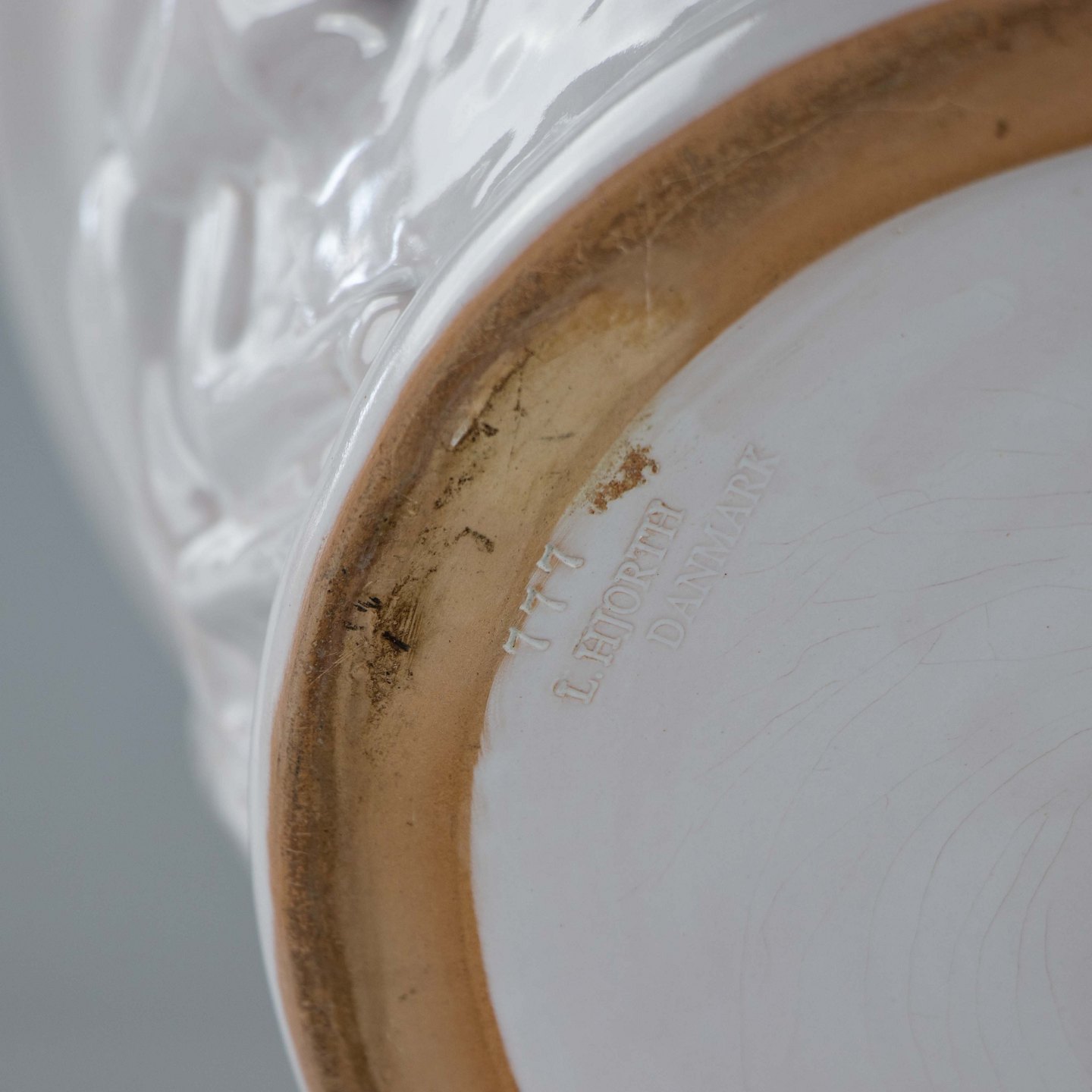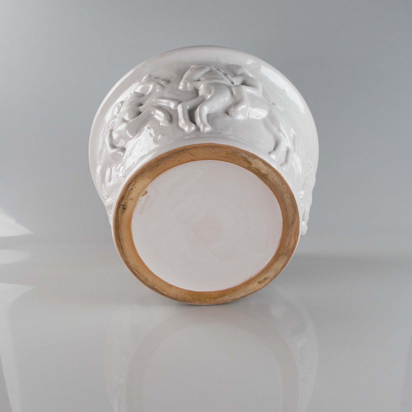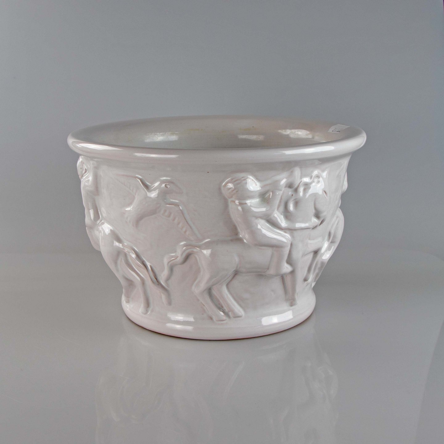 Potteskjuler i hvidlakeret keramik med motiv af heste, ryttere og fugl nr. 777
