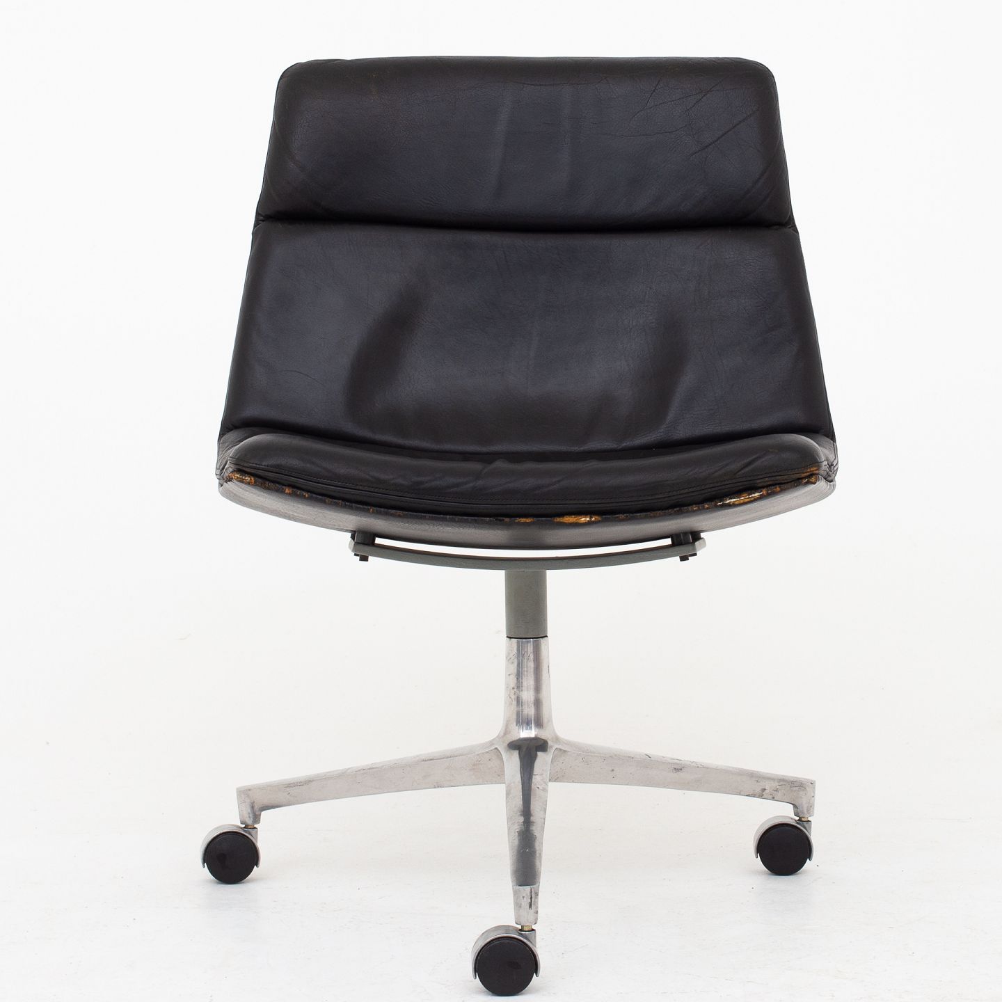 Office chair in original black leather on three-wheel base of matt-chromed steel.