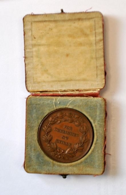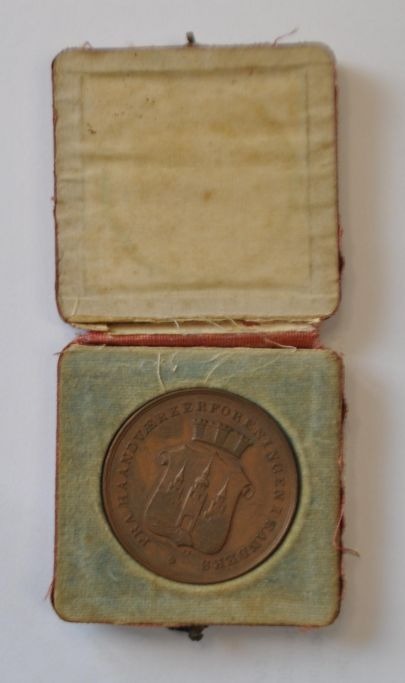 Craftsman medal, 19th century Randers, Denmark. Copper. For ability and kind. The Craftsmen's Association in Randers. In original box.