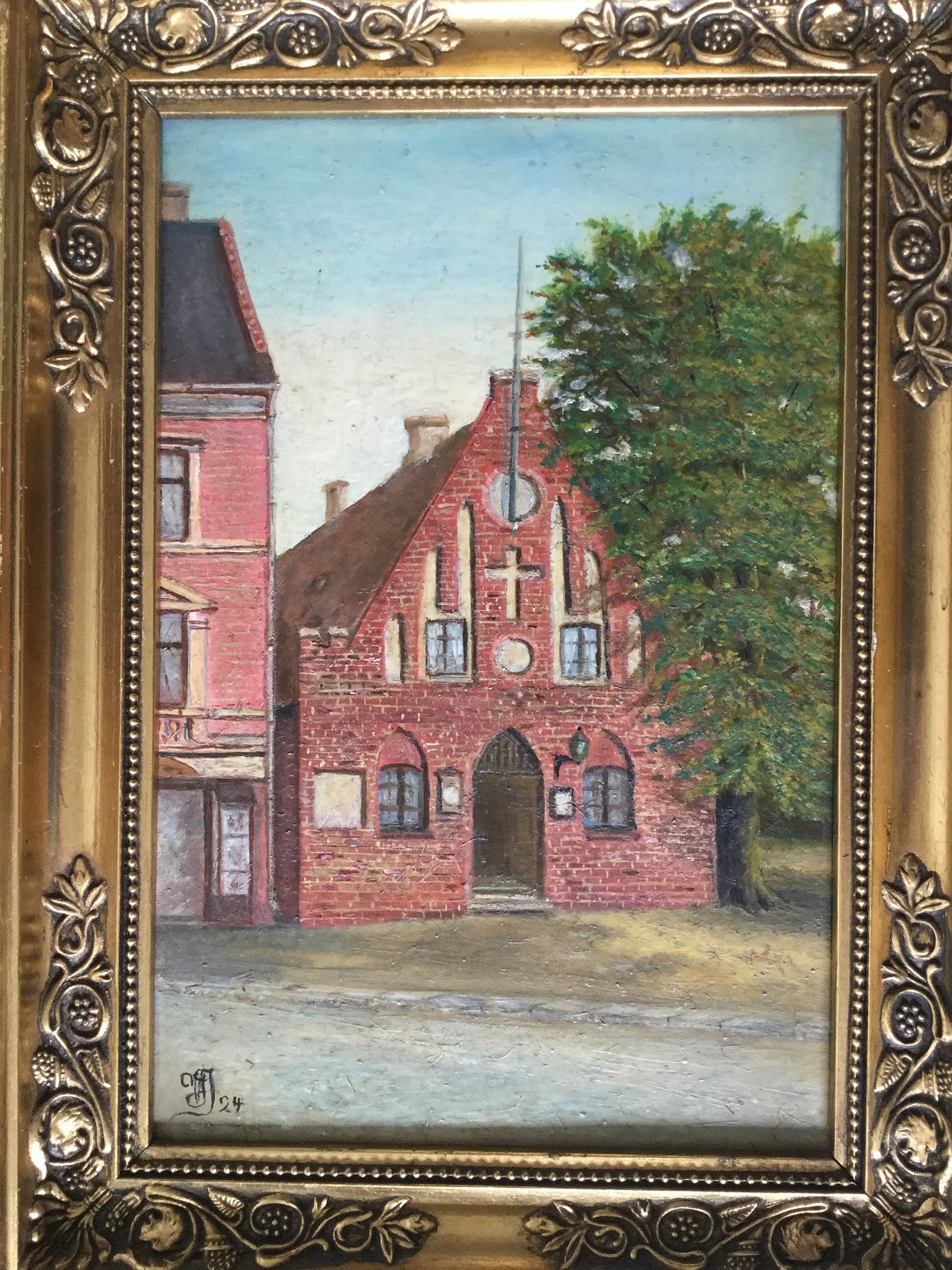 2 malerier i smukke guldrammer - motiver fra Slagelse 1920'erne.