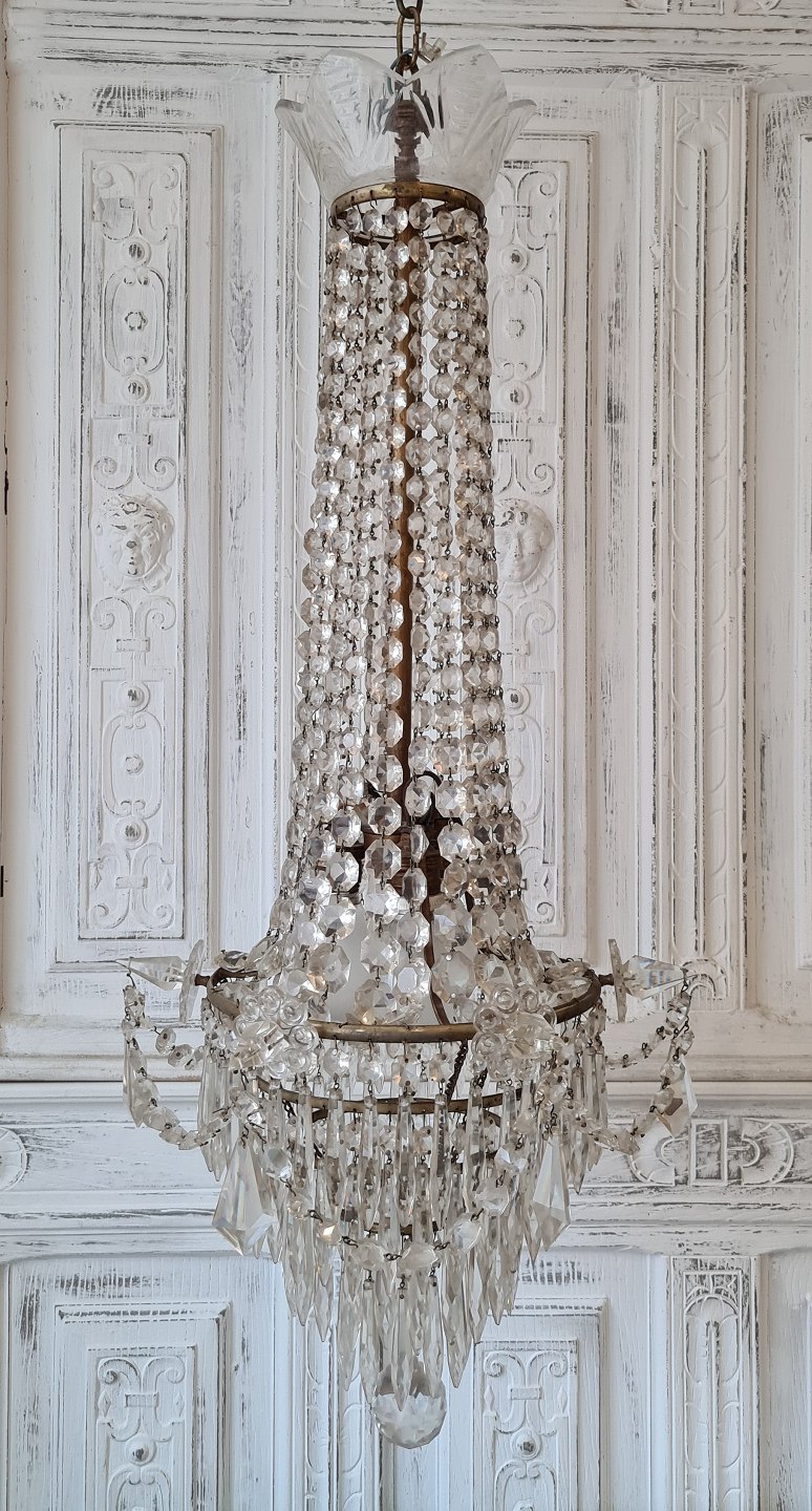 Stor smuk gammel prismelysekrone med tre lyskilder.