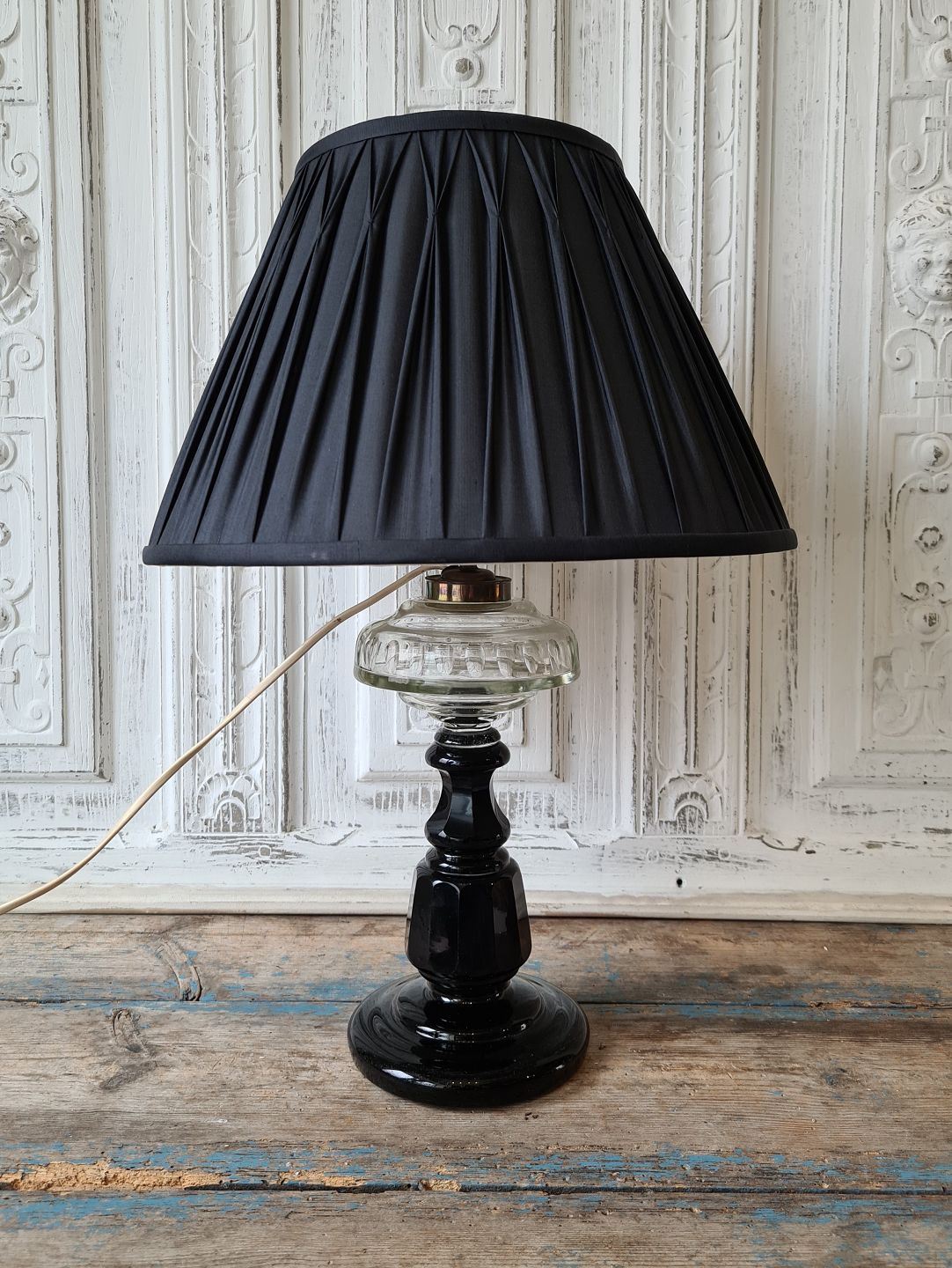 Smuk 1800tals sort opaline lampe med oliebeholder i klart glas med olivenslibninger.