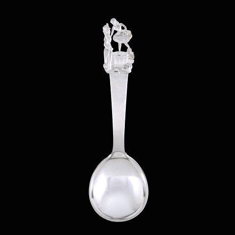 H.C. Andersen Eventyrbestik. 'Den Standhaftige Tinsoldat'. Rund barne/dessertske i sølv med motiv fra H.C. Andersens eventyr. L. 14,5 cm.