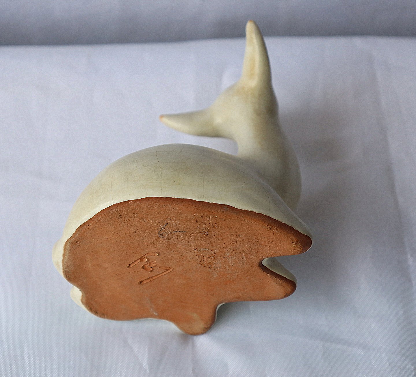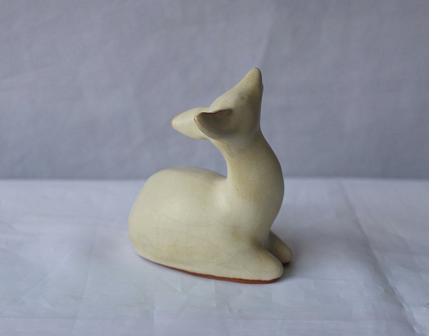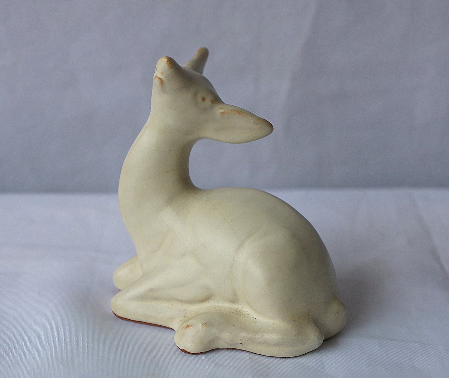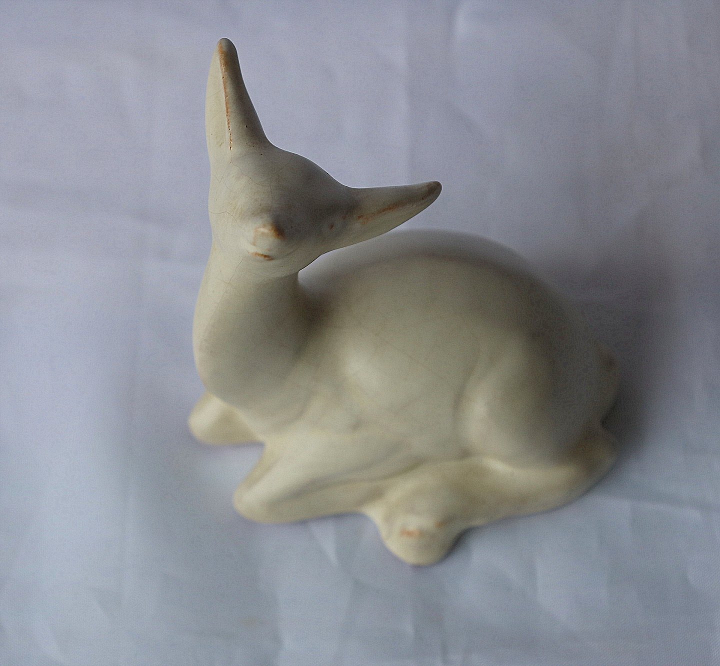 Liggende dådyr. Dådyret er lavet af keramik og glaseret cremefarvet