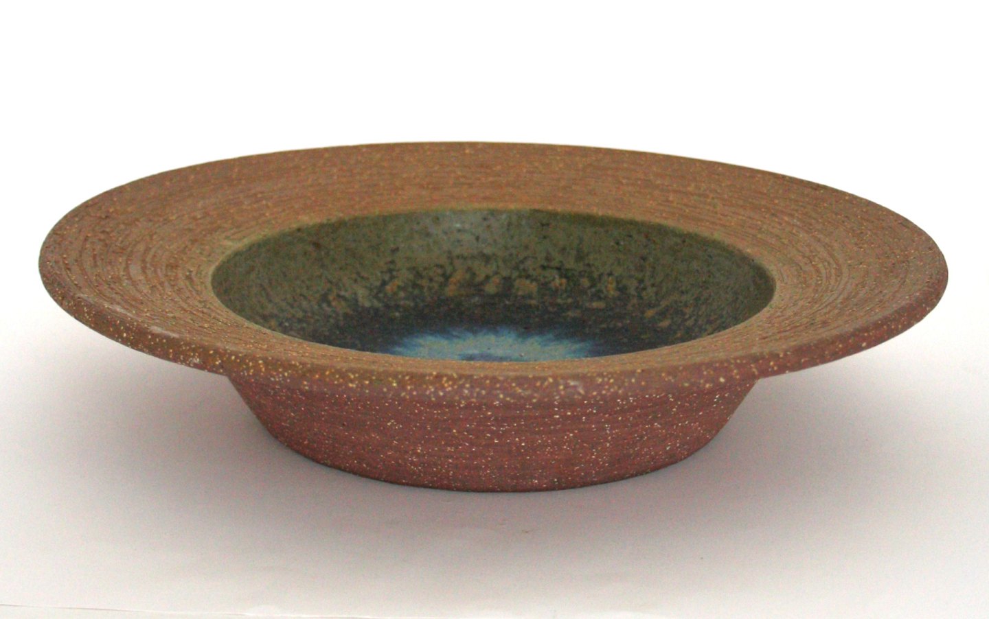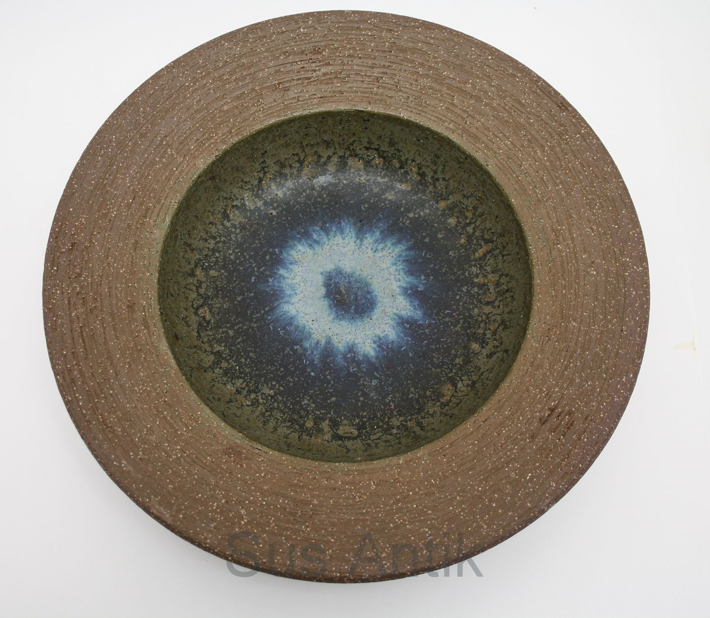 Palshus keramik, Stort fad med blålig mat glasur og bred uglaseret fane i chamotte stentøj. Fra 1960-70érne. Diameter 32,5 cm. Højde 7 cm. Signeret PL-S Denmark. Per Linnemann-Schmidt. Flot stand. Pris: 1.275 kr.