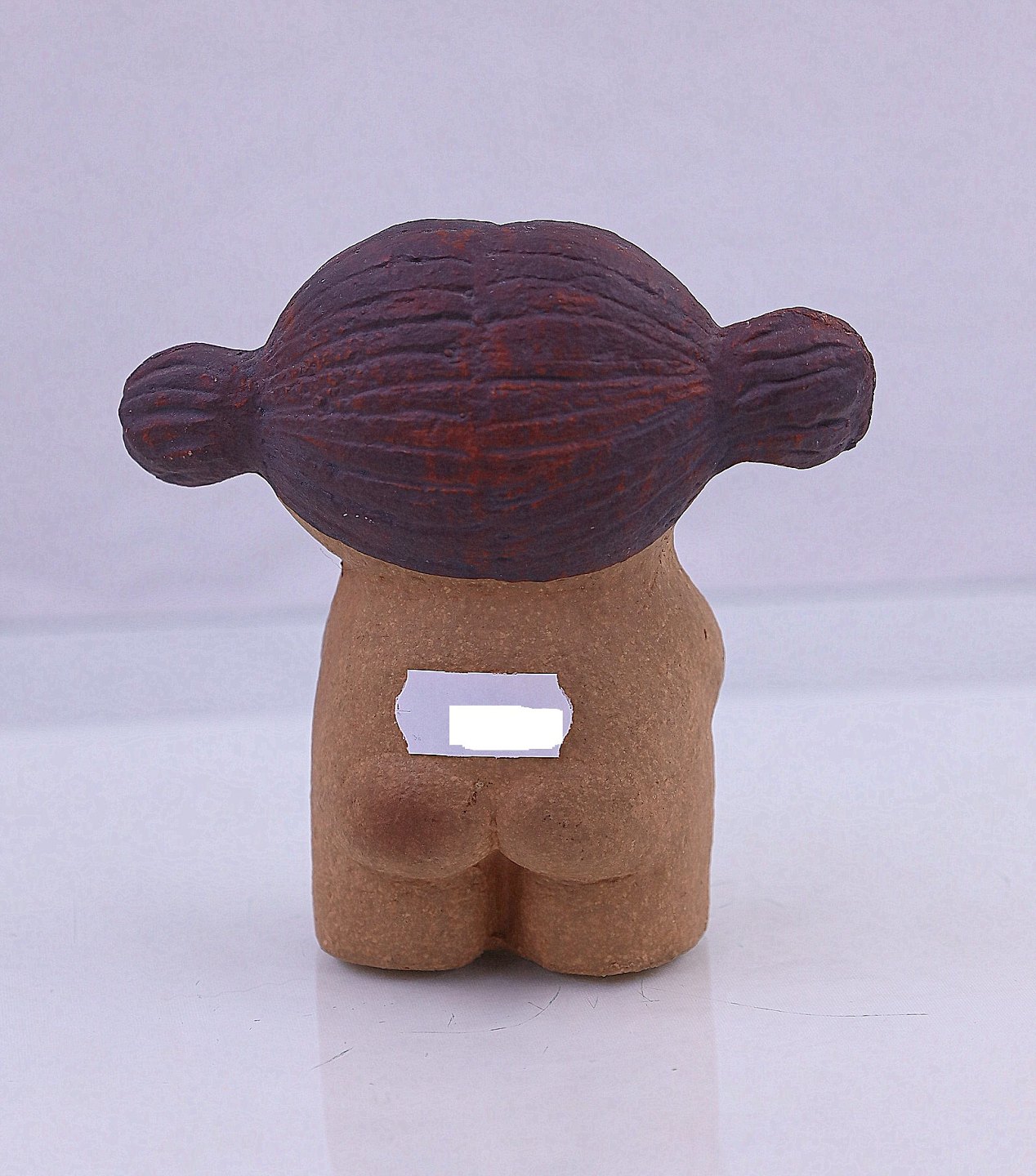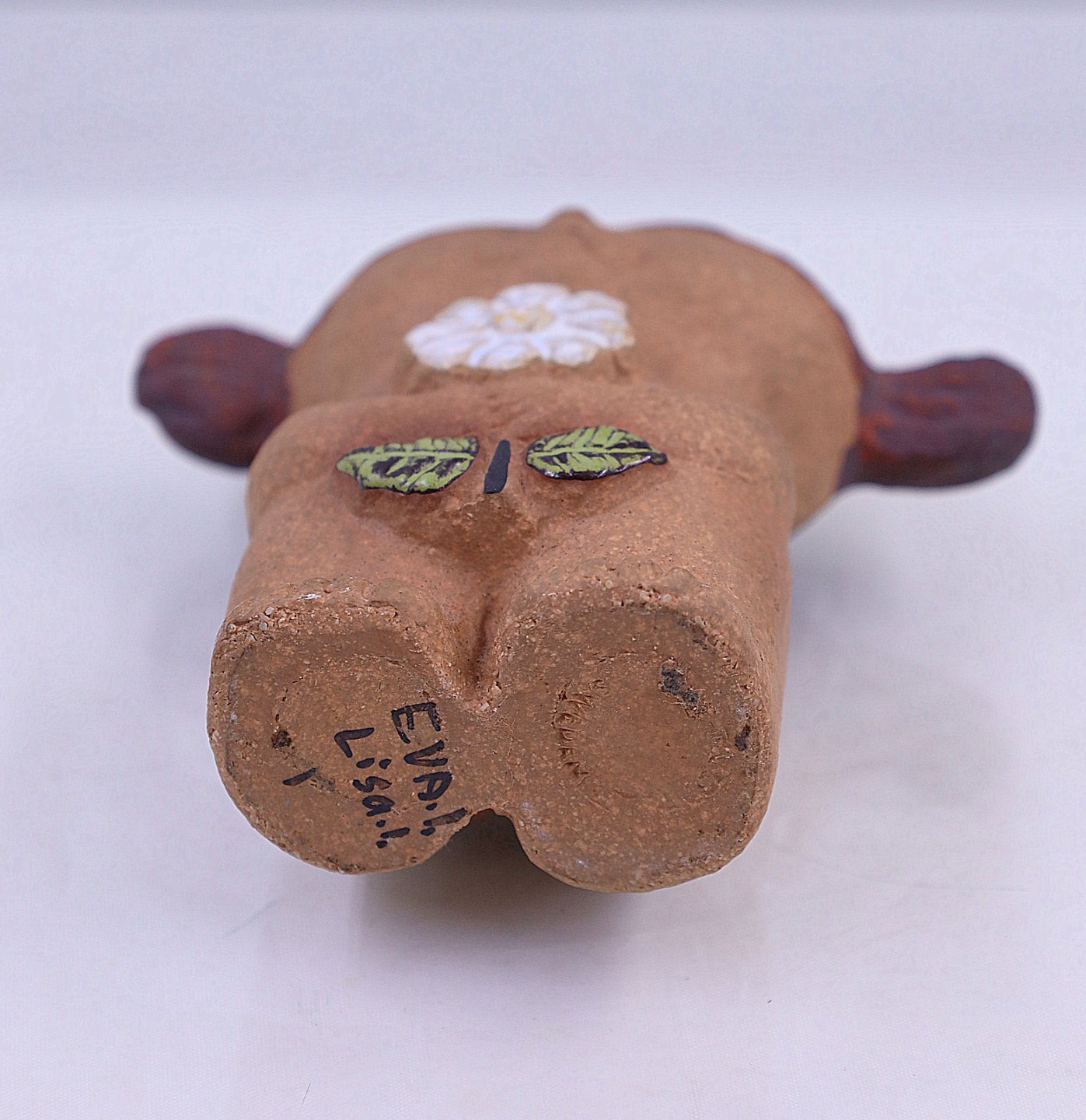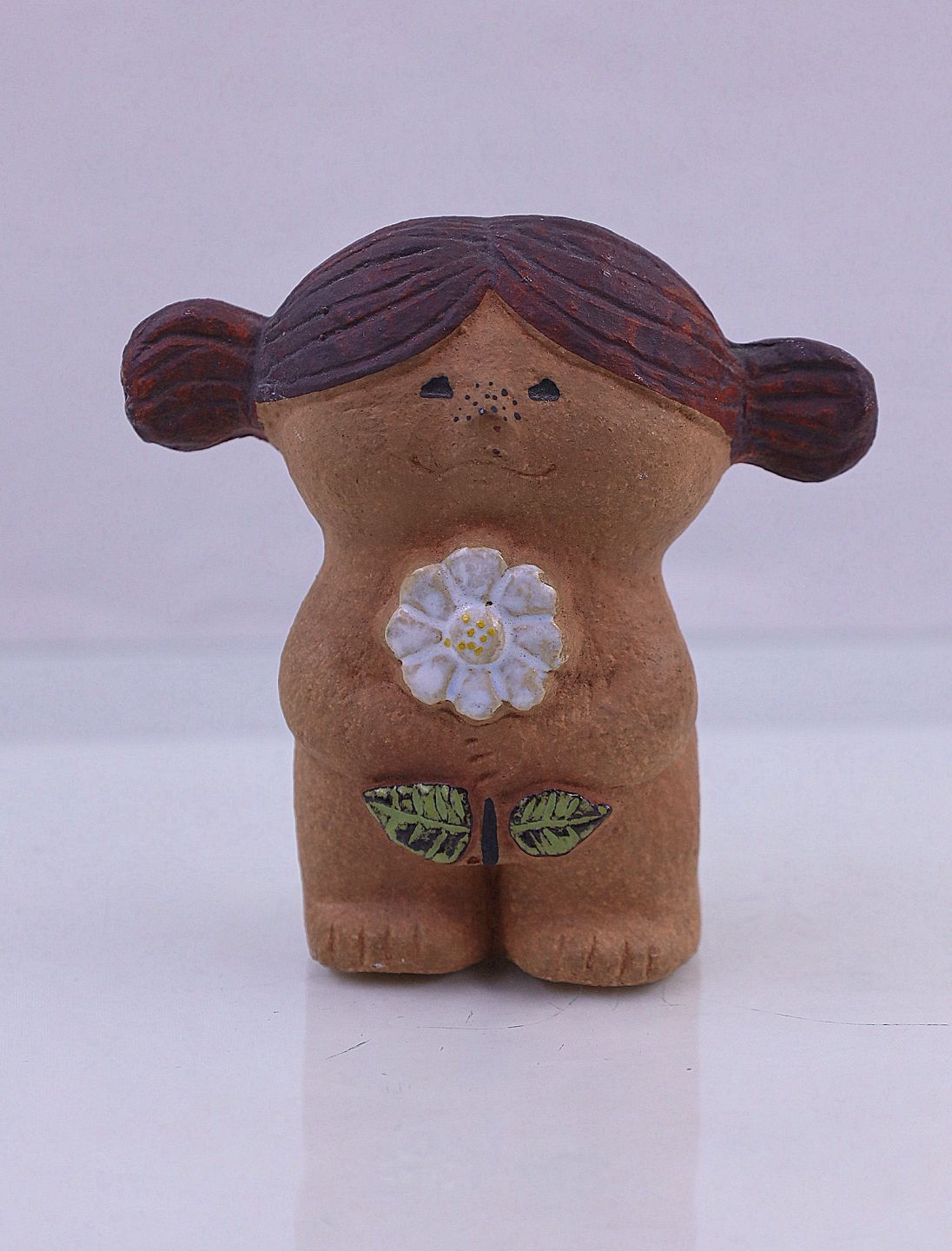 Lisa Larson for Gustavsberg. "Eva 1" har fregner, brunt hår og er dekoreret med et grønt blad og en blomst i hånden.