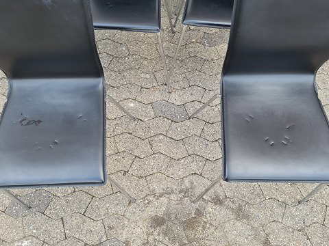 10 nyere fremstillede spisebordsstole i nappa og metal. Enkelte brugsspor på sæder fra at have været stablet.