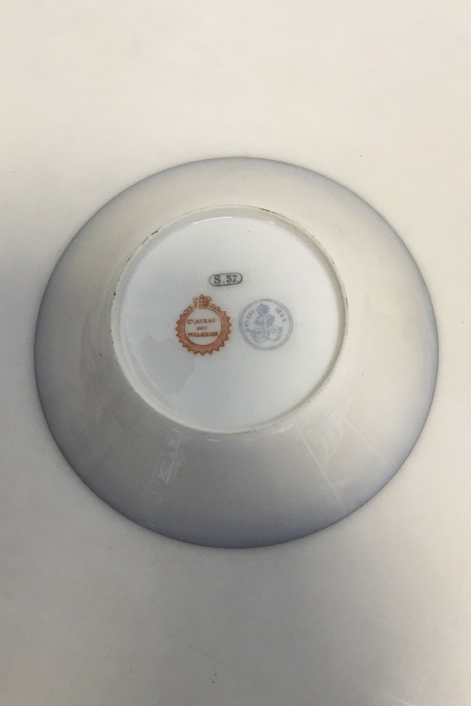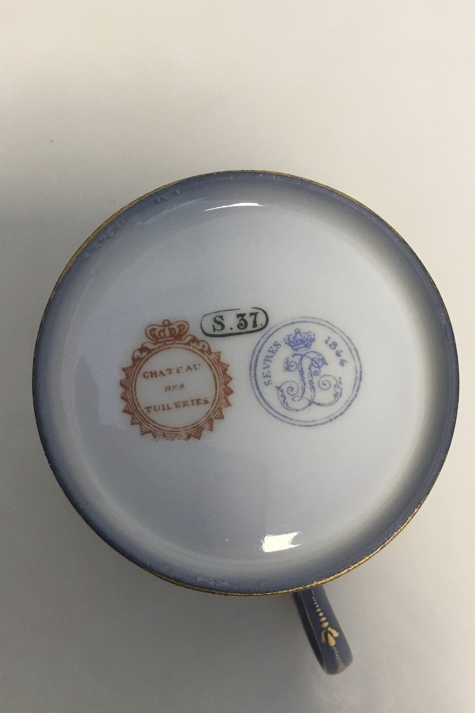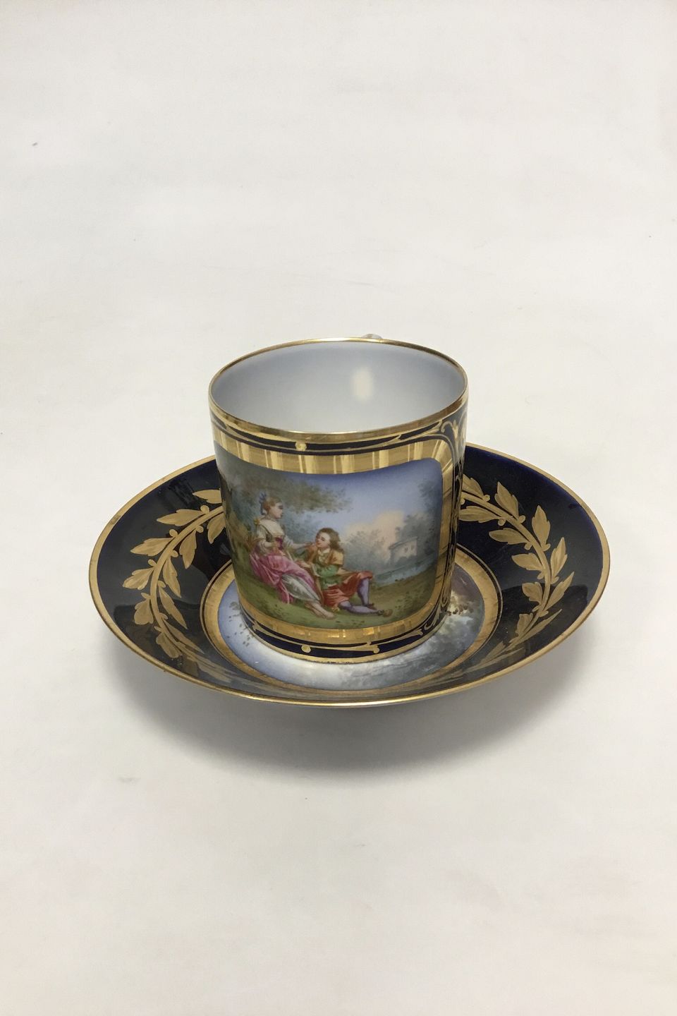 A Sevres Porcelain Cabinet Cup and Saucer, 1844. The dark blue and gilt cup with a scenery of a woman and a gentleman in the gardens. The saucer with landscape and a river. Both with factory mark and date and "S.37". Height of cup 7 cm (2 3/4")