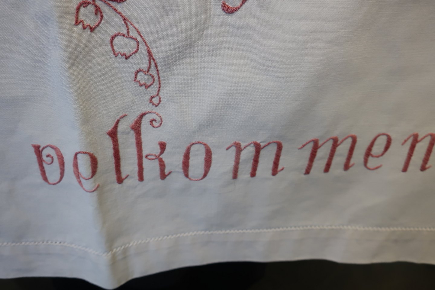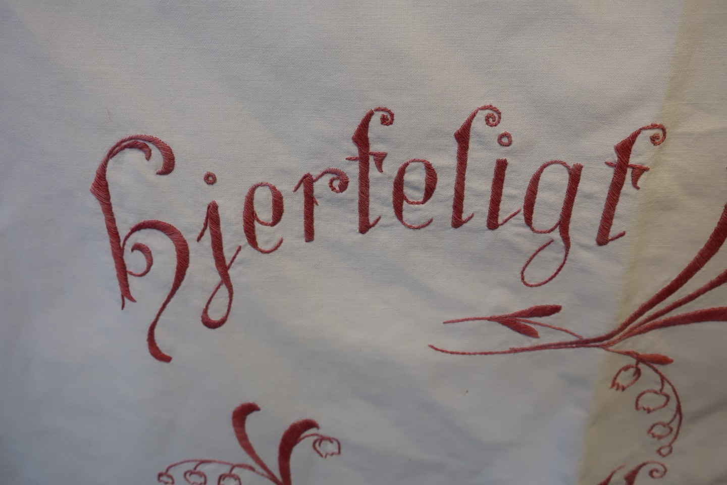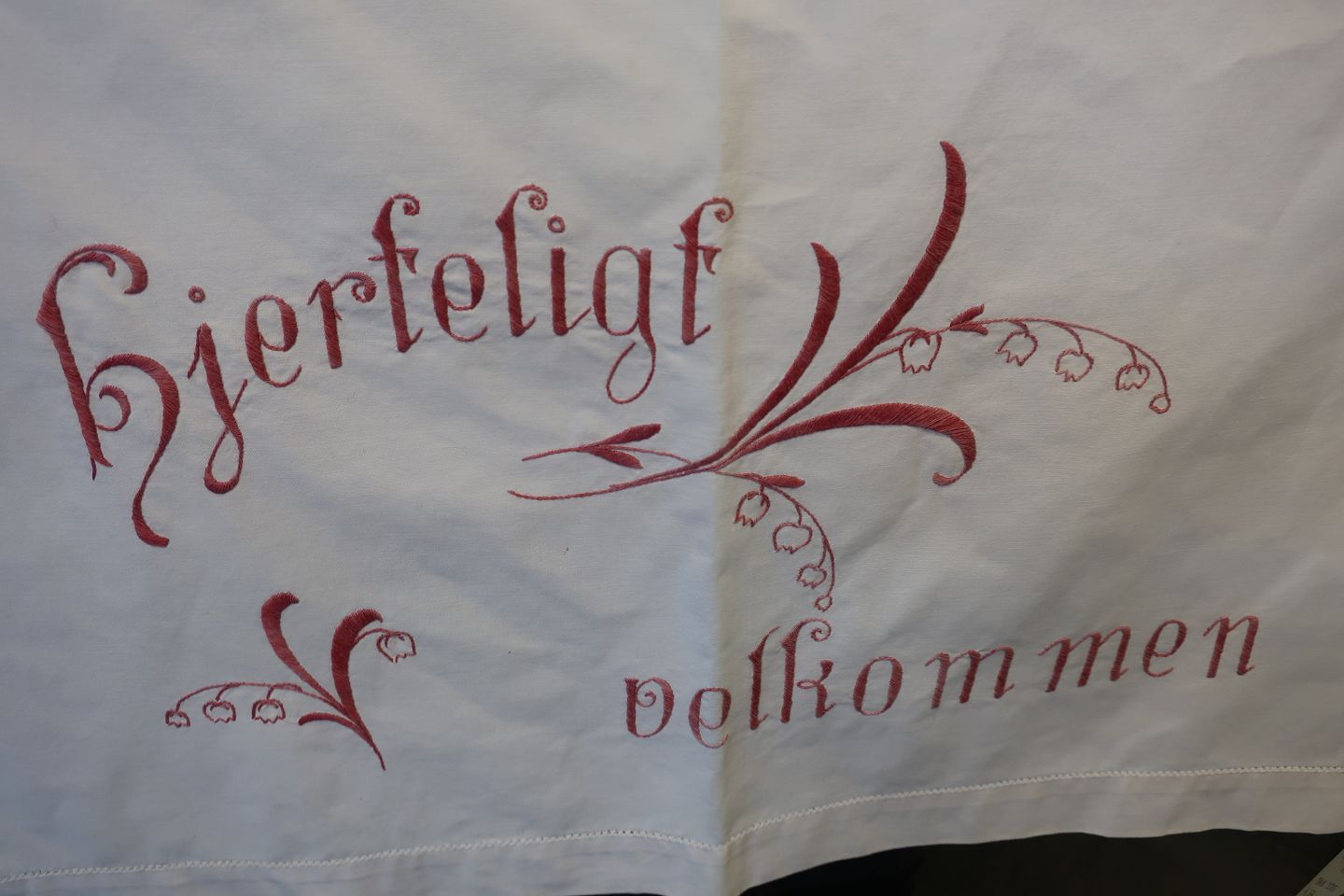 A beautiful old parade piece with handmade red embroidery with the text "Hjerteligt velkommen" (Heartfelt welcome)
