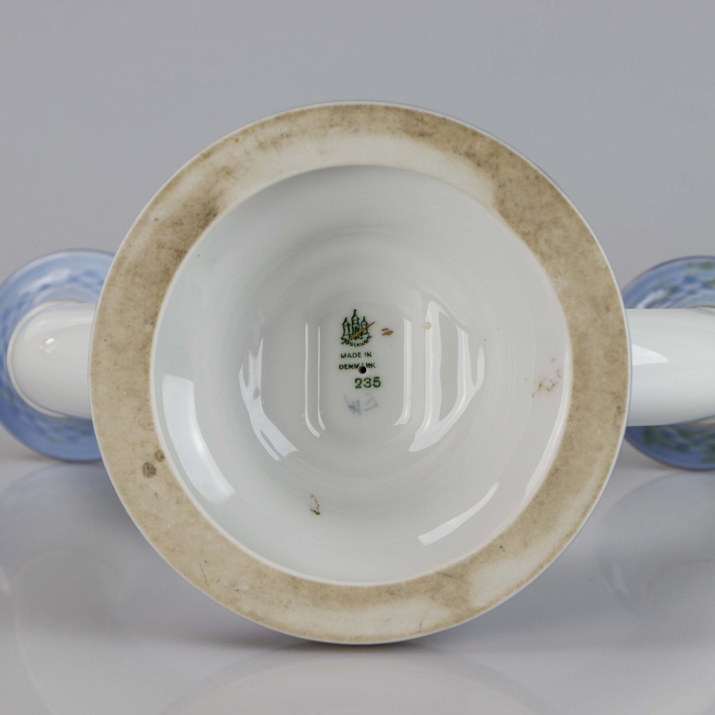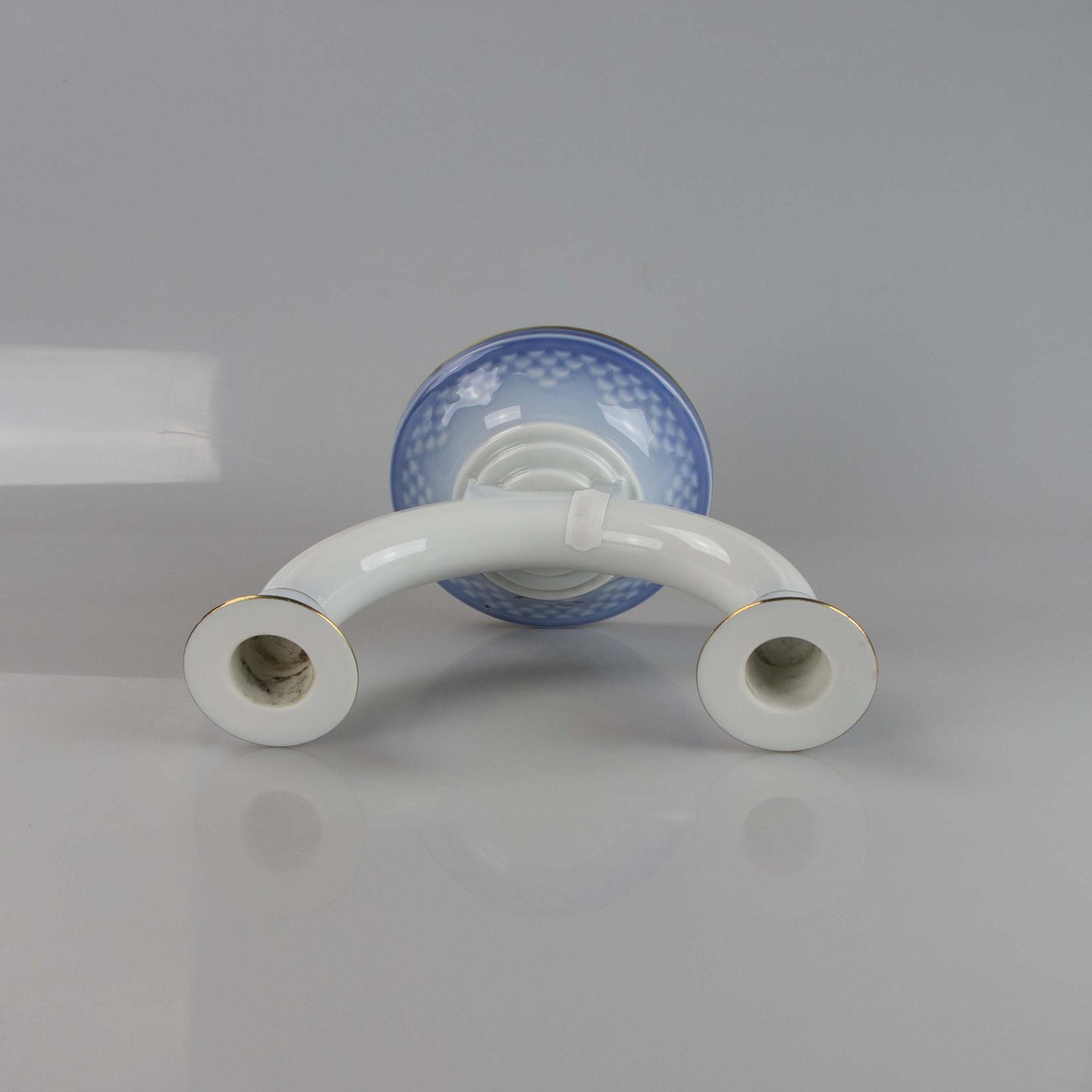 Lysestage fremstillet i porcelæn med skelform i gradueret blå nuancer med guldkant samt motiv af måge.