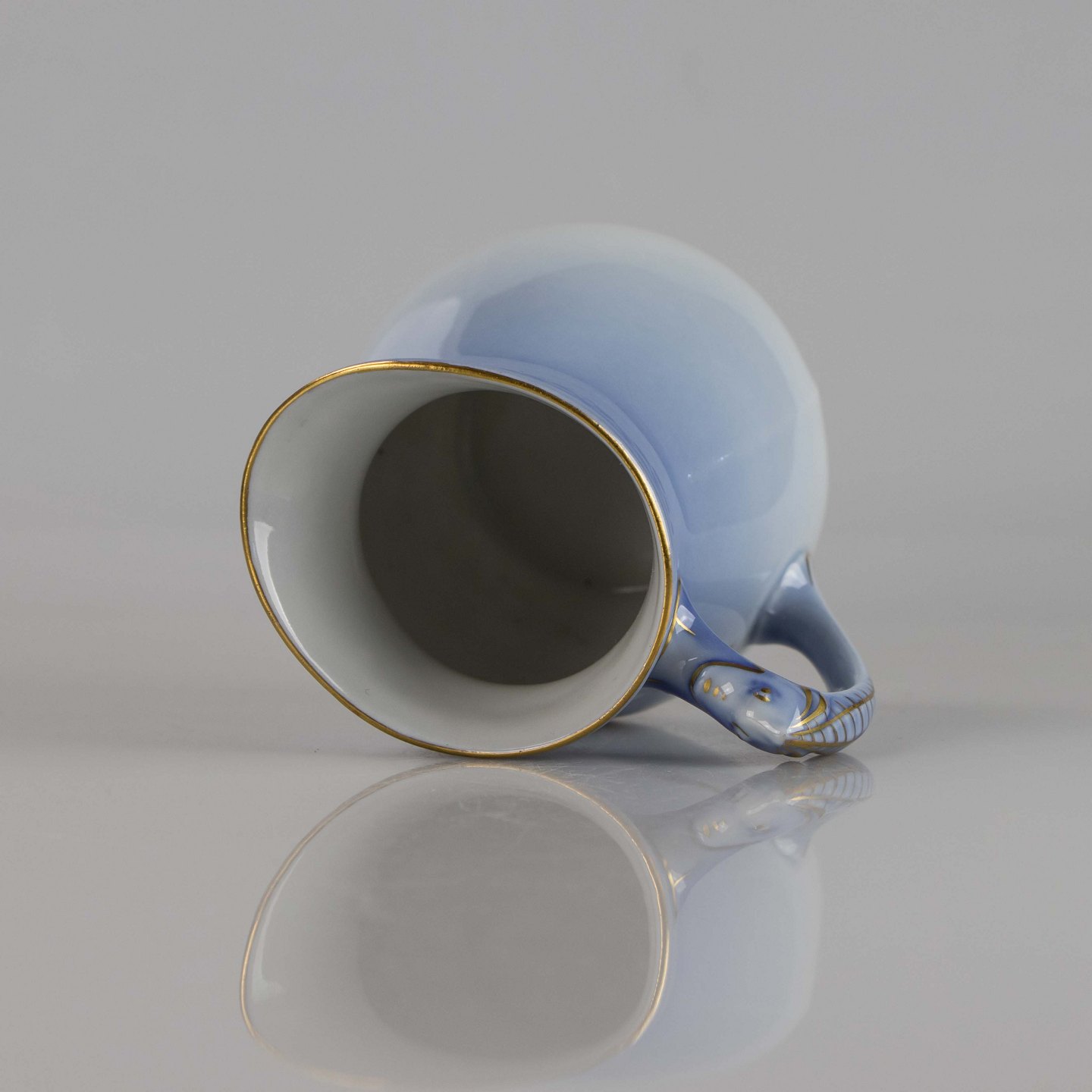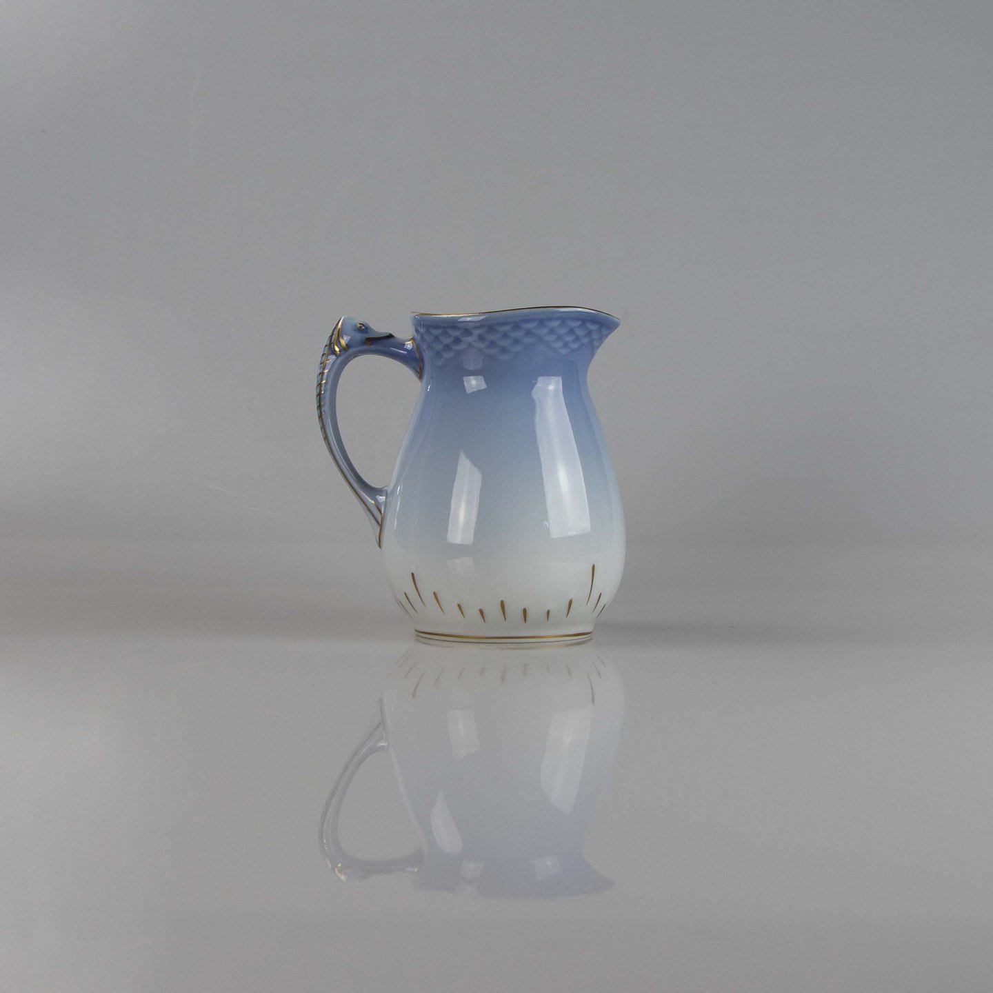 Kande fremstillet i porcelæn med skelform i gradueret blå nuancer med guldkant samt motiv af måge.