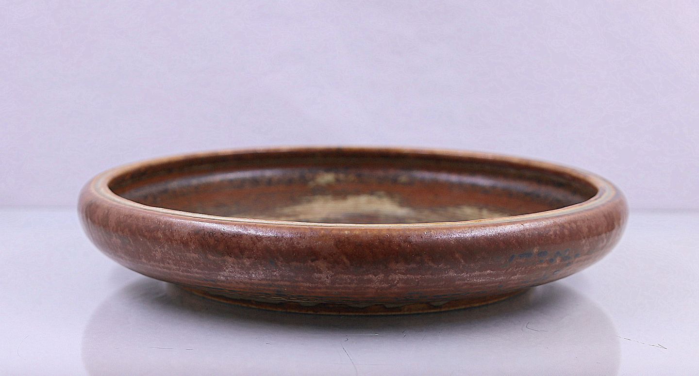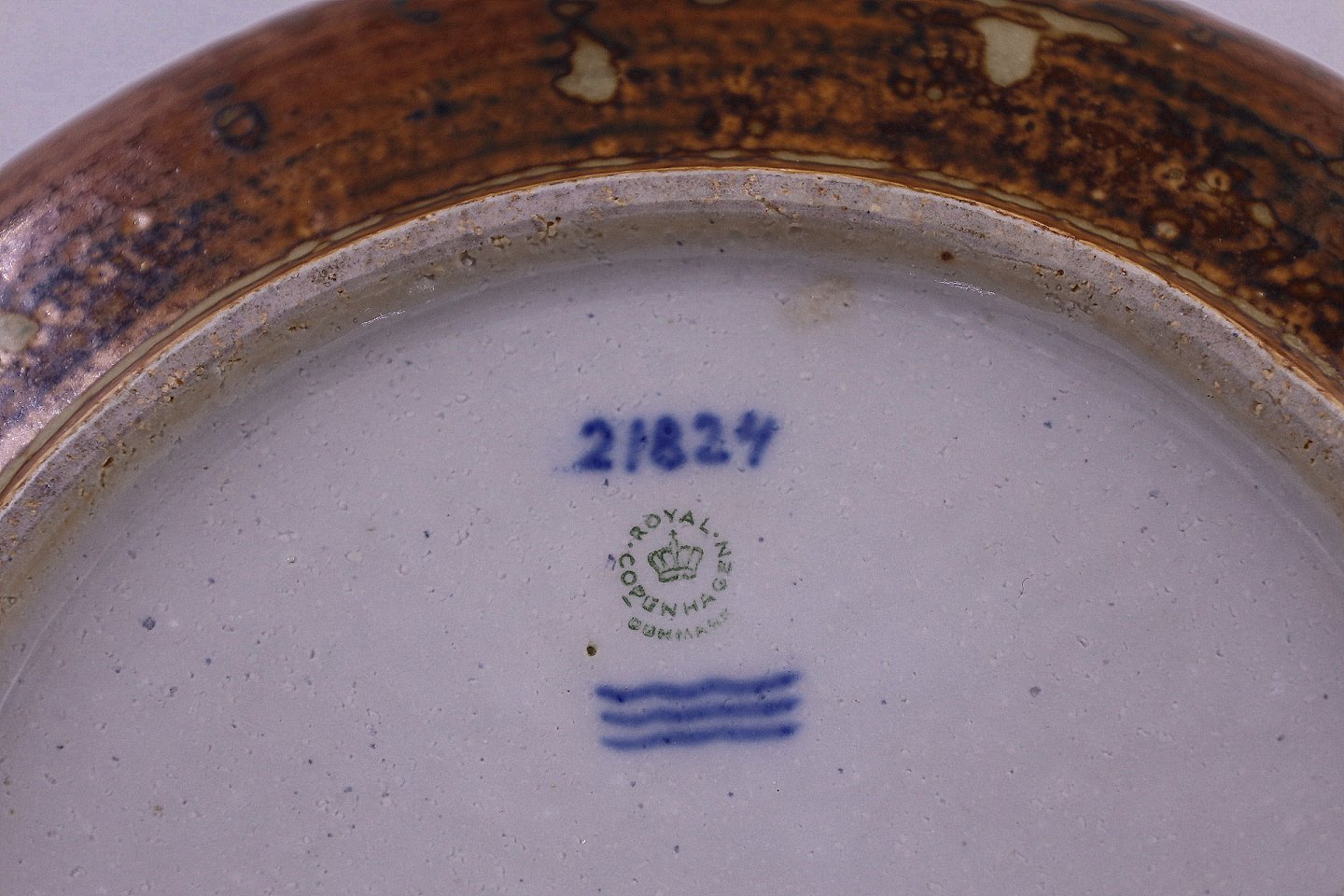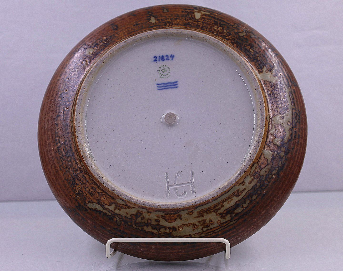 Text available in Danish: Royal Copenhagen. Bordfad i keramik, nr 21824. Fadet changerer i brunlige farver. Fadet er signeret og 1. sortering.
