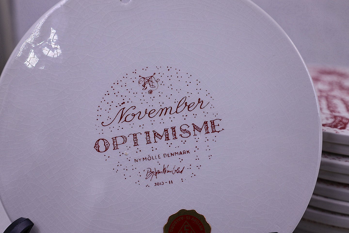 Text available in Danish: Bjørn Wiinblad. Månedsplatter/brikker med rød dekor. Platterne viser "Året for et kærrestepar", det viser fra de mødes i januar til der kommer barn i december.