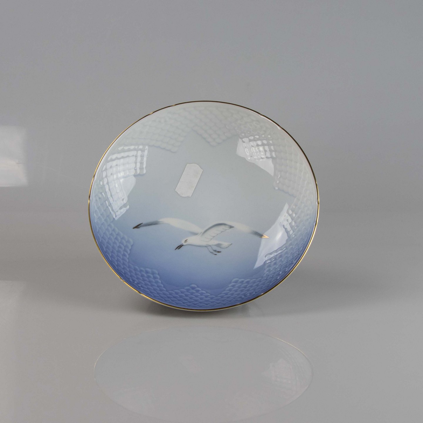 Kande fremstillet i porcelæn med skelform i gradueret blå nuancer med guldkant samt motiv af måge.