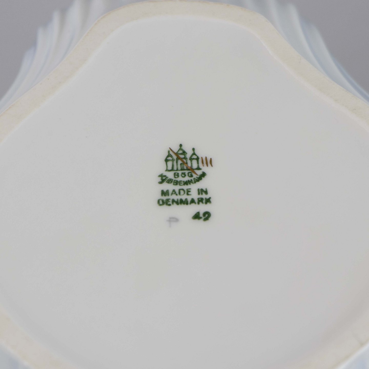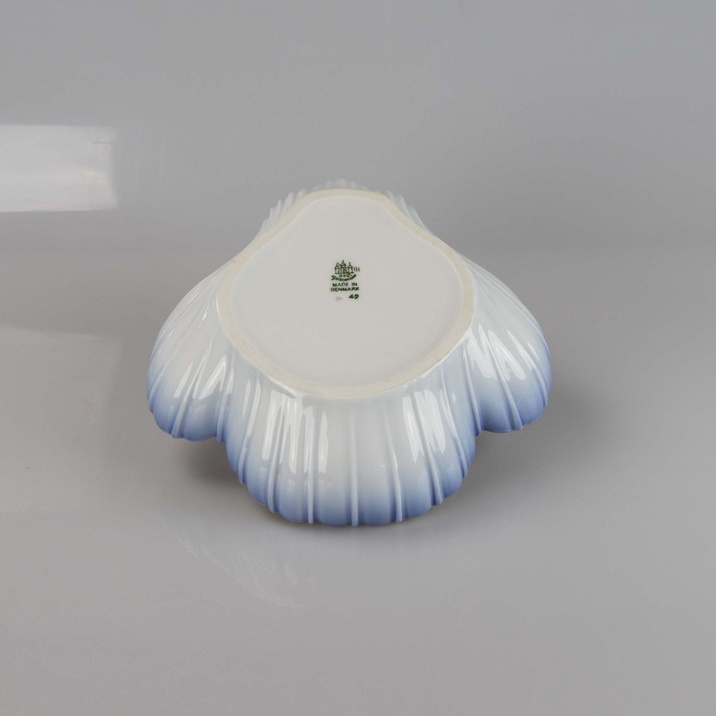 Skål fremstillet i porcelæn med skelform i gradueret blå nuancer med guldkant samt motiv af måge.