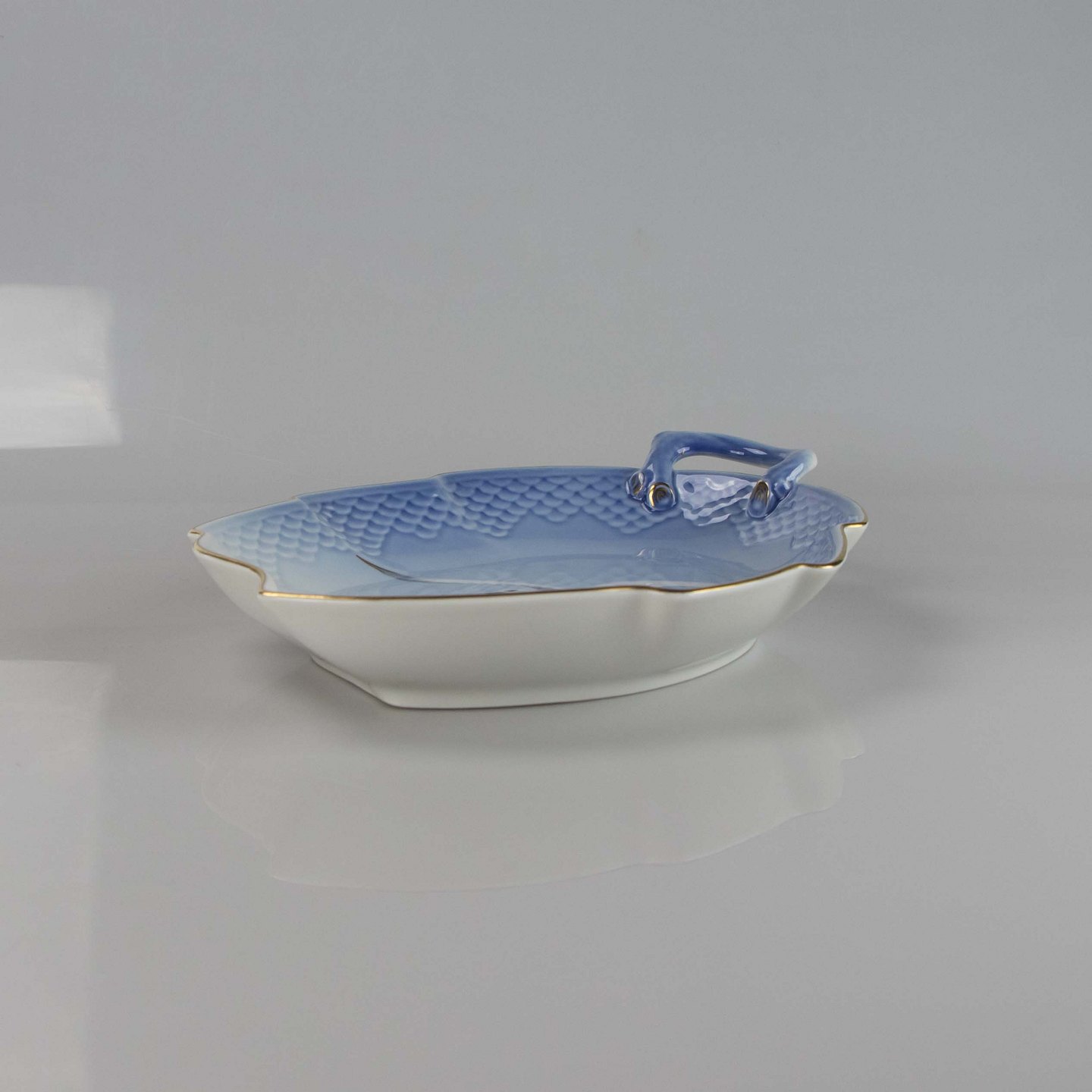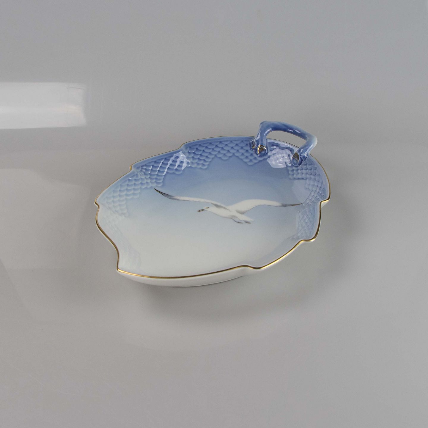 Kagefad fremstillet i porcelæn med skelform i gradueret blå nuancer med guldkant samt motiv af måge.