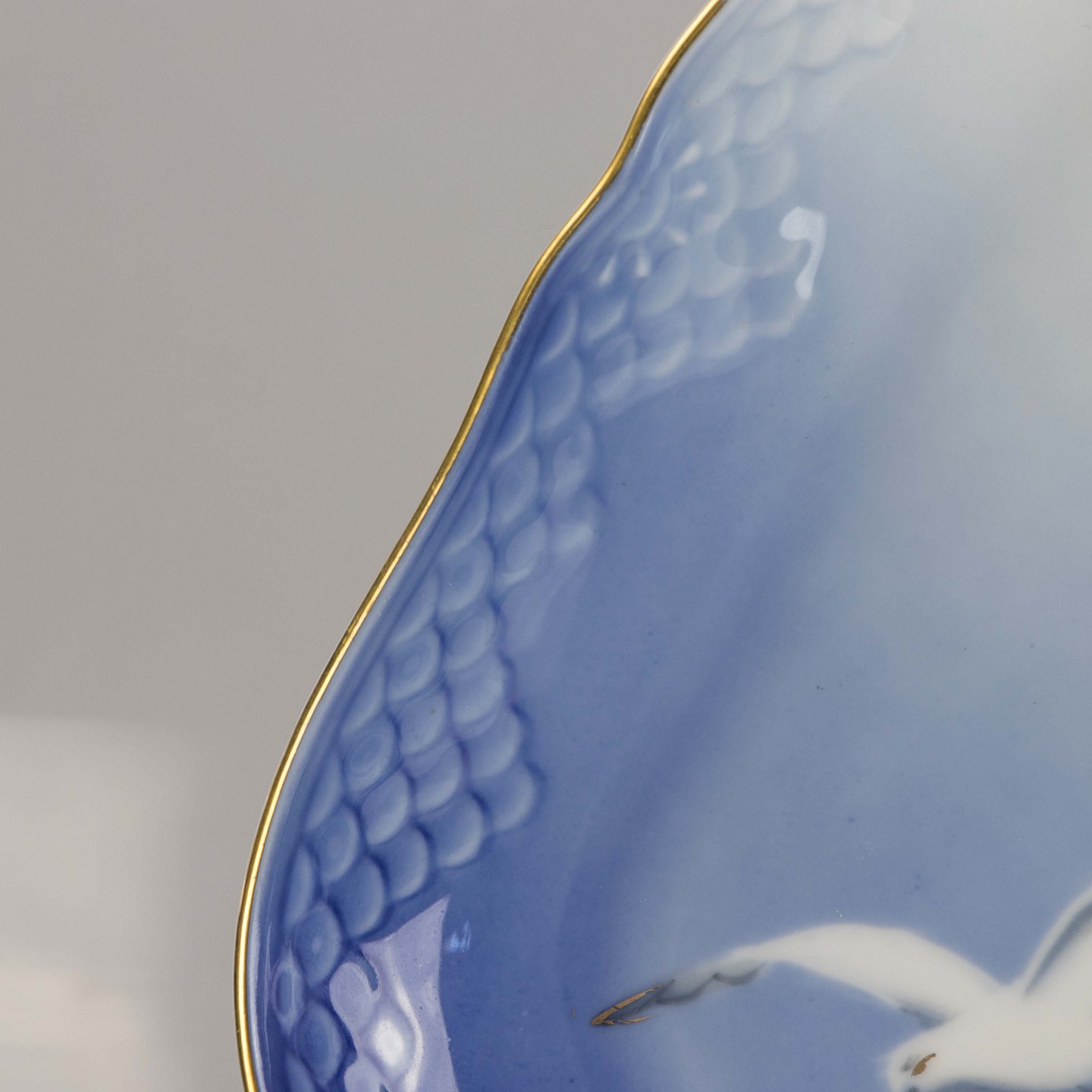 Fad fremstillet i porcelæn med skelform i gradueret blå nuancer med guldkant samt motiv af måge.