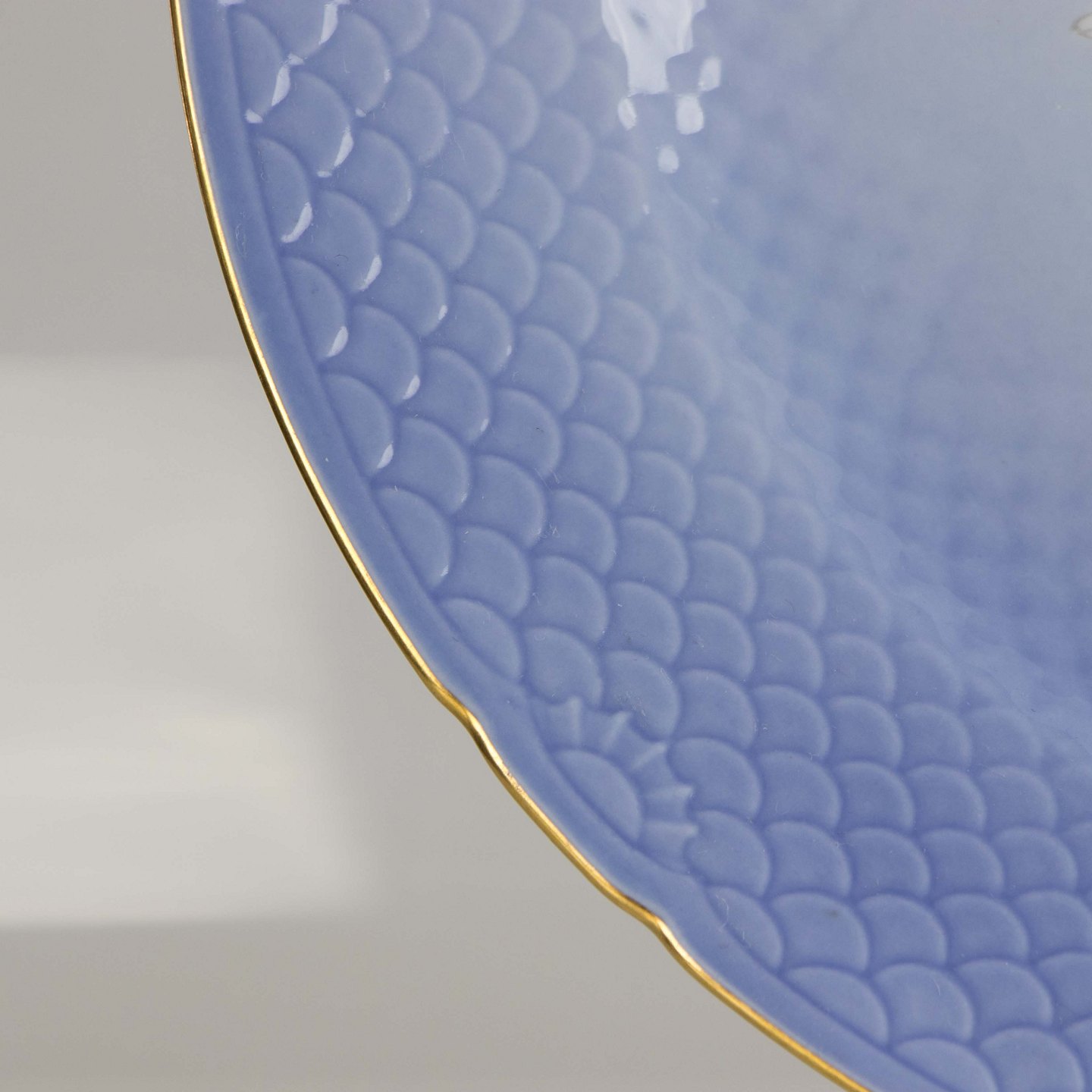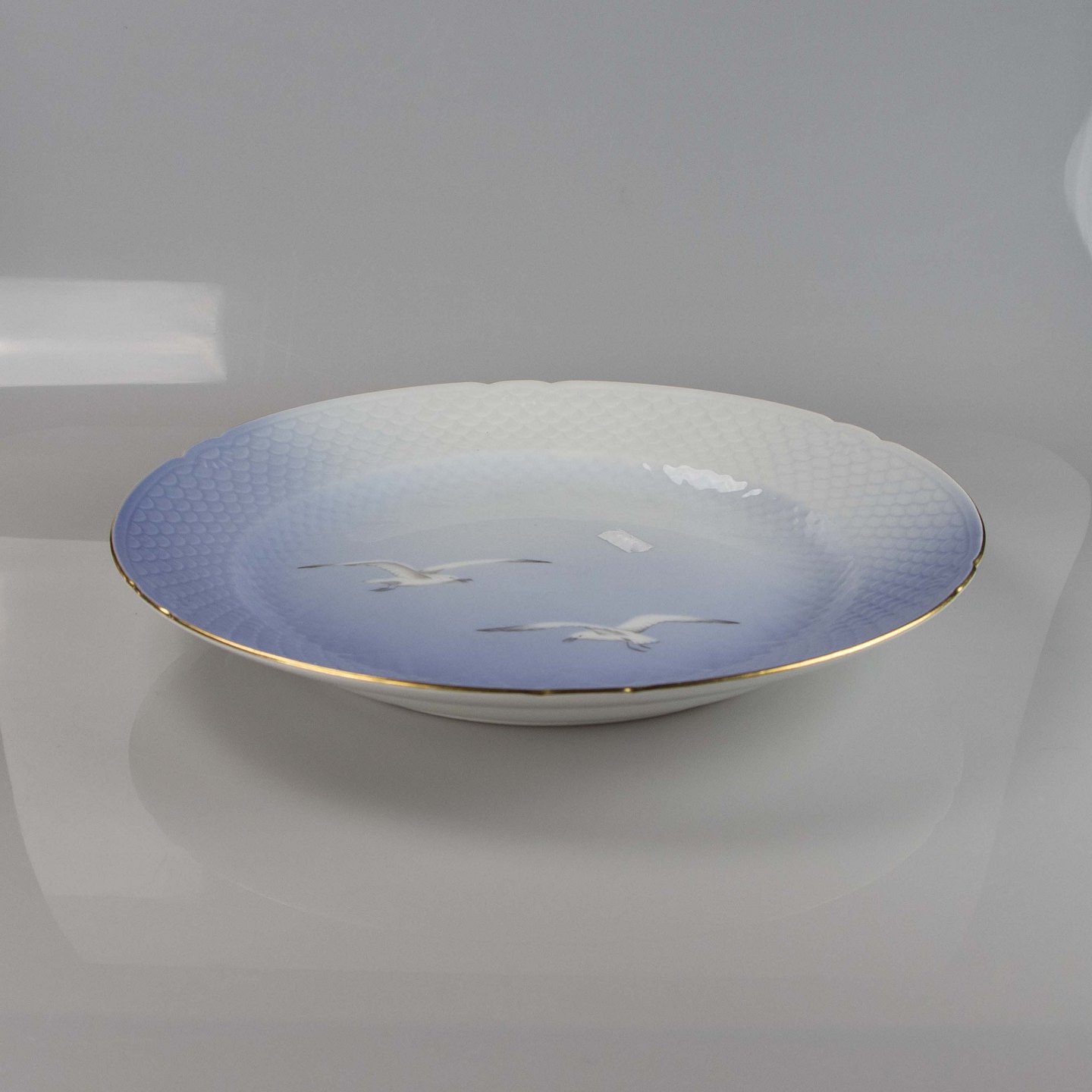 Serveringsfad fremstillet i porcelæn med skelform i gradueret blå nuancer med guldkant samt motiv af måge.
