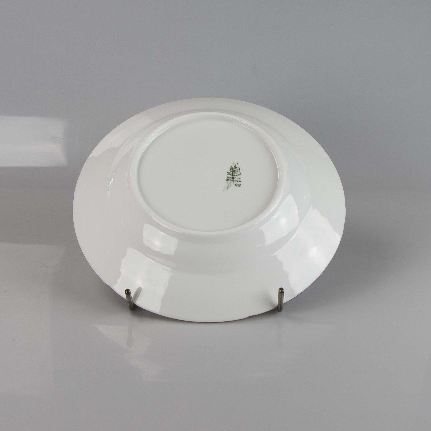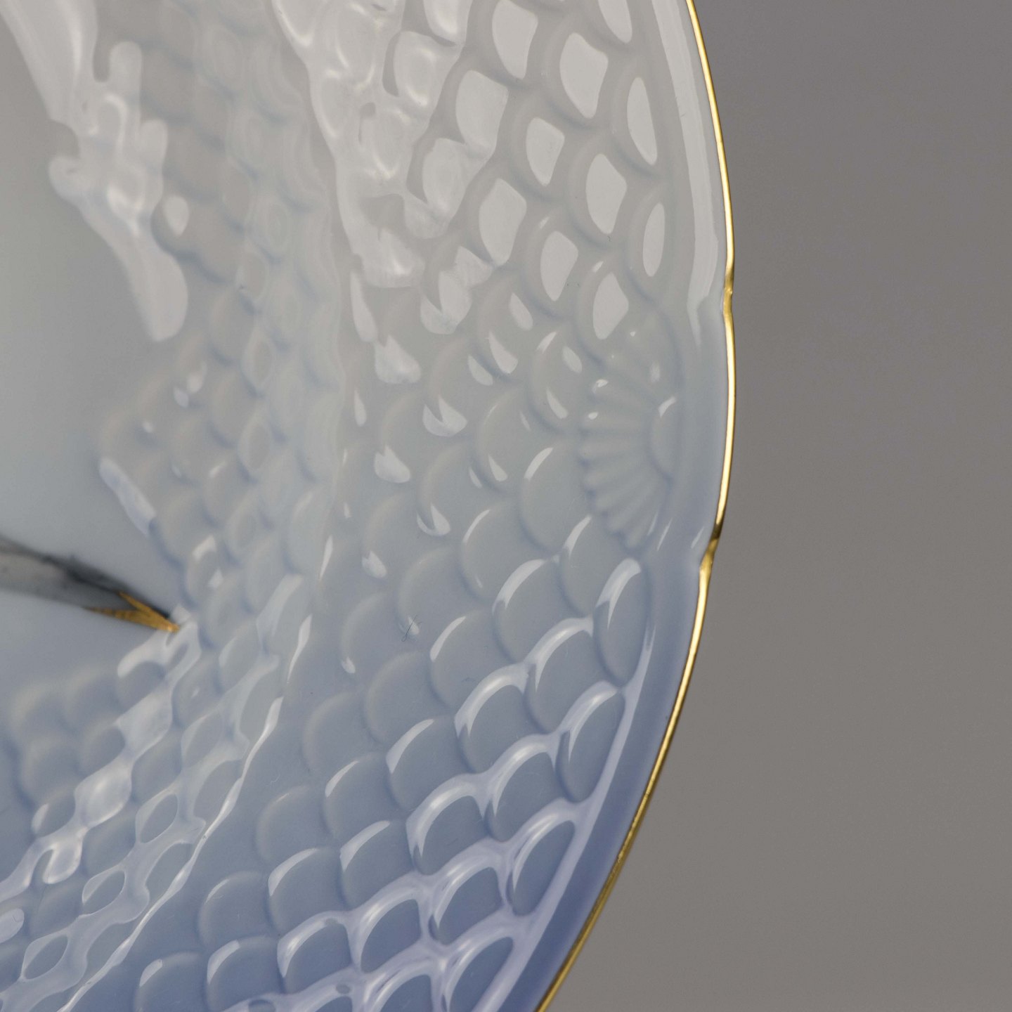Tallerken fremstillet i porcelæn med skelform i gradueret blå nuancer med guldkant samt motiv af måge.