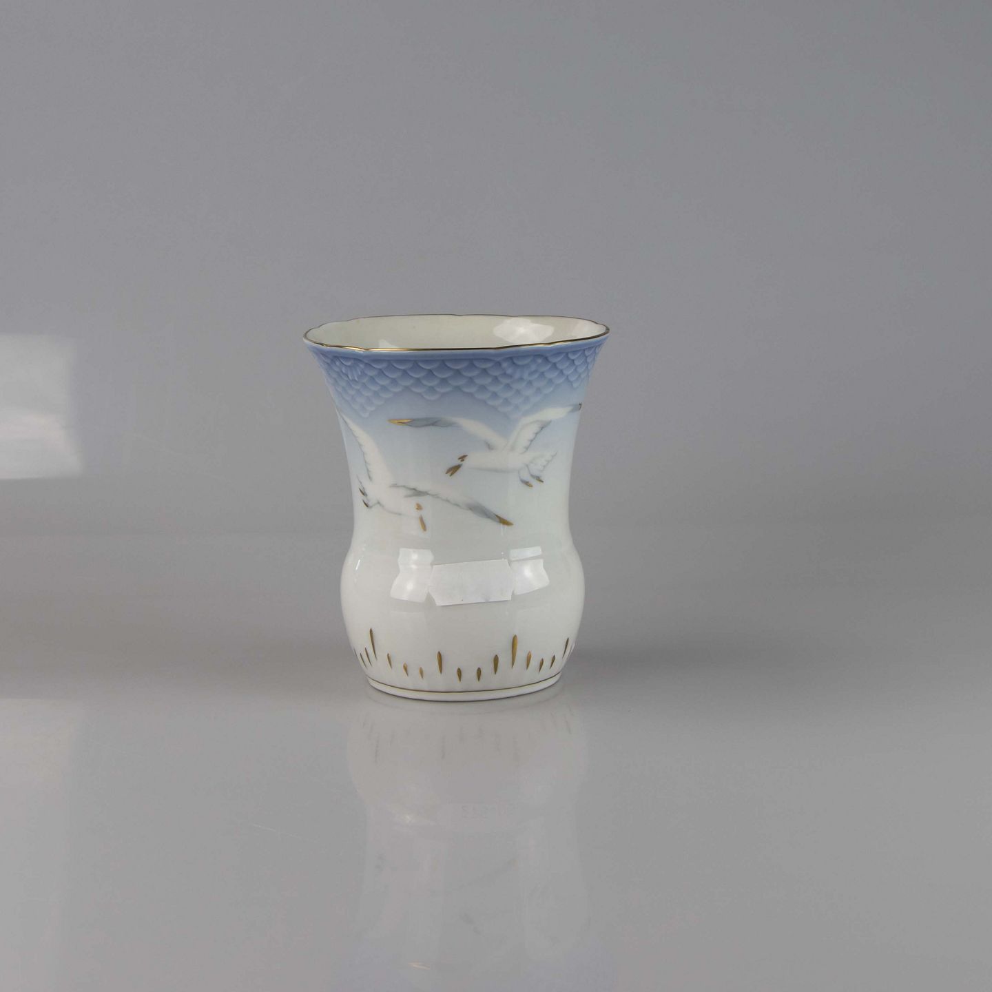 Vase fremstillet i porcelæn med skelform i gradueret blå nuancer med guldkant samt motiv af måge.