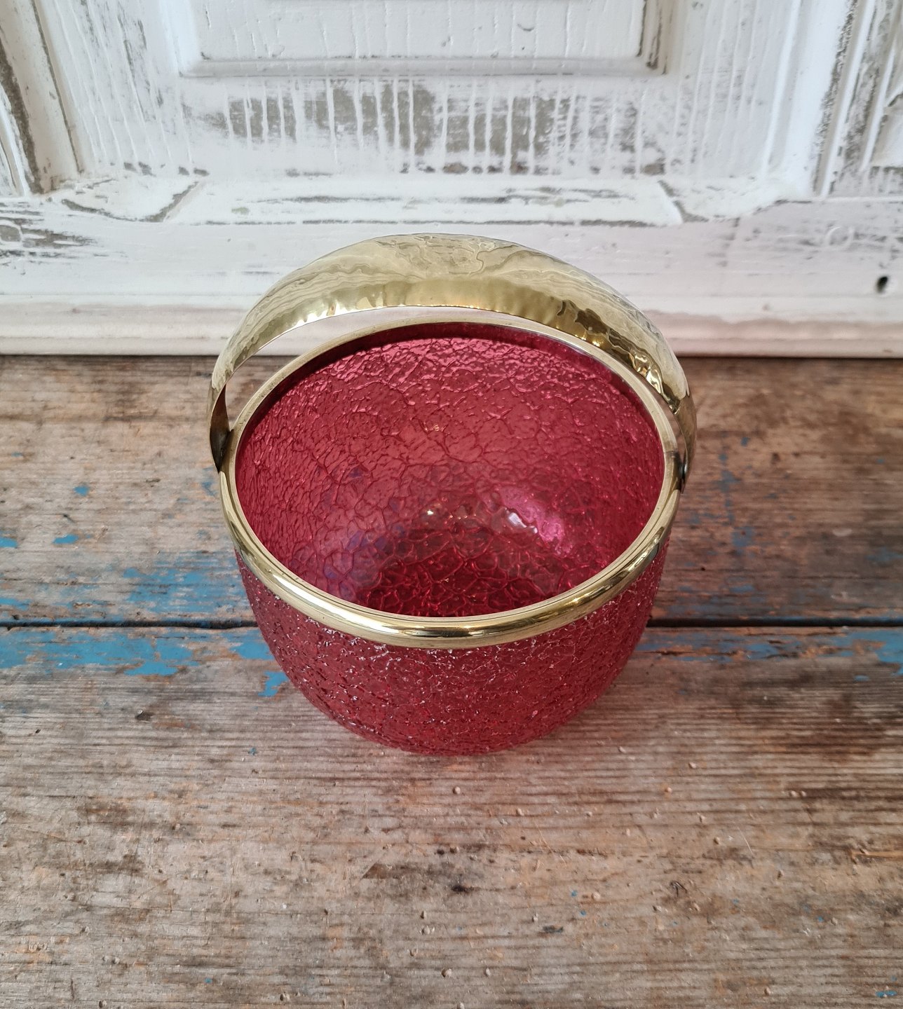1800 tals sukkerskål i hindbærfarvet glas med messingmontering