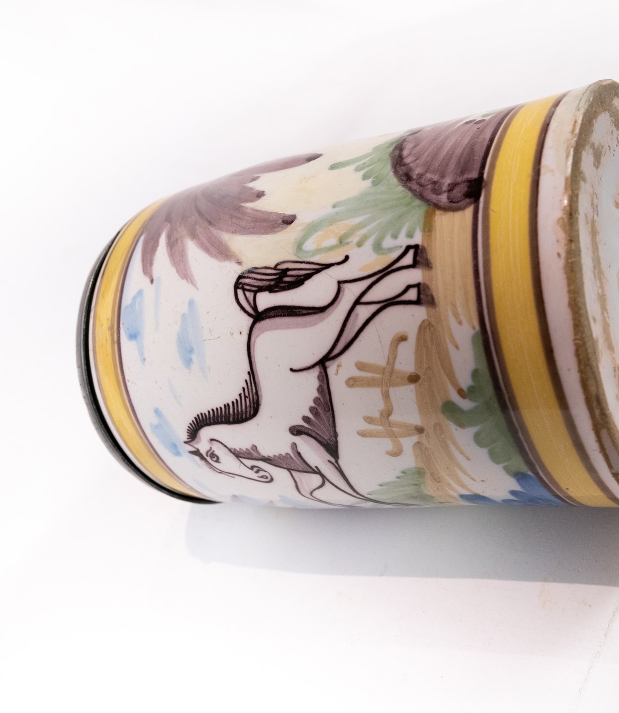 Ceramic lidded jar with horse motif from Germany around the 1780s, in great vintage condition.