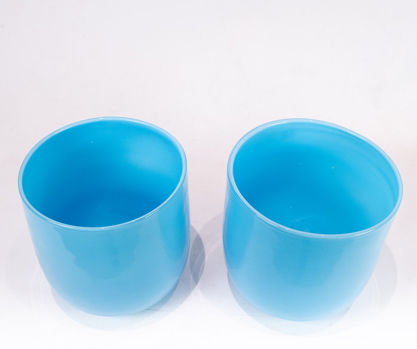 A pair of flower pots in light blue glass by Holmegaard. The vases are in great vintage condition.