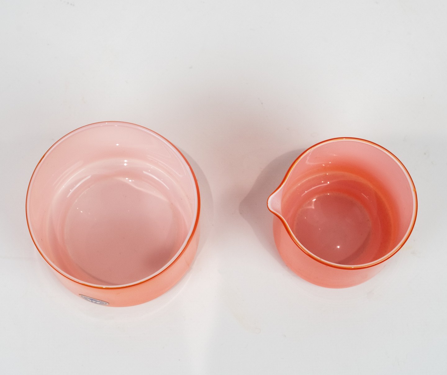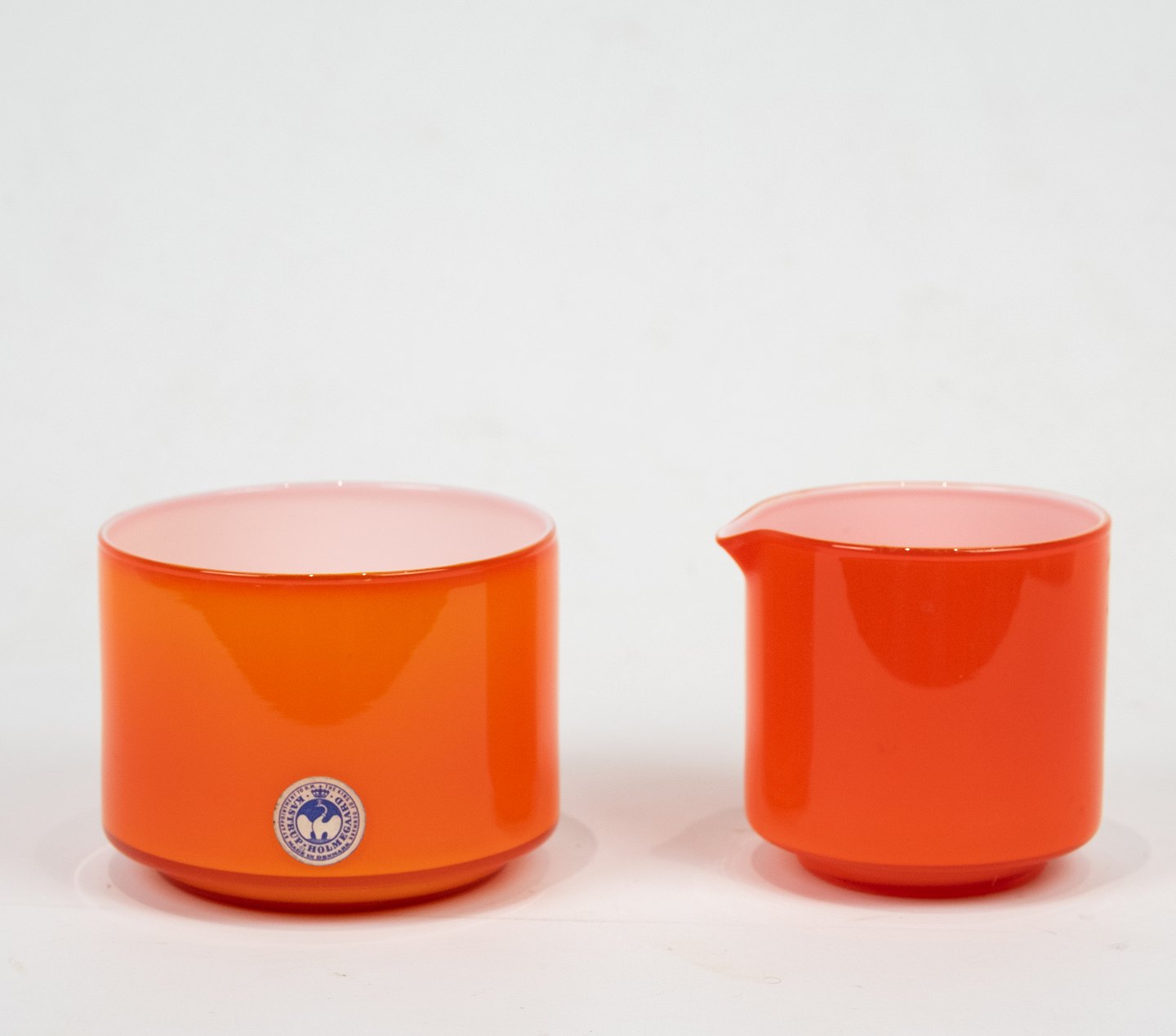 Orange glass sugar bowl and red glass cream jug with white opaline glass on the inside from the Palet series by Michael Bang for Holmegaard.