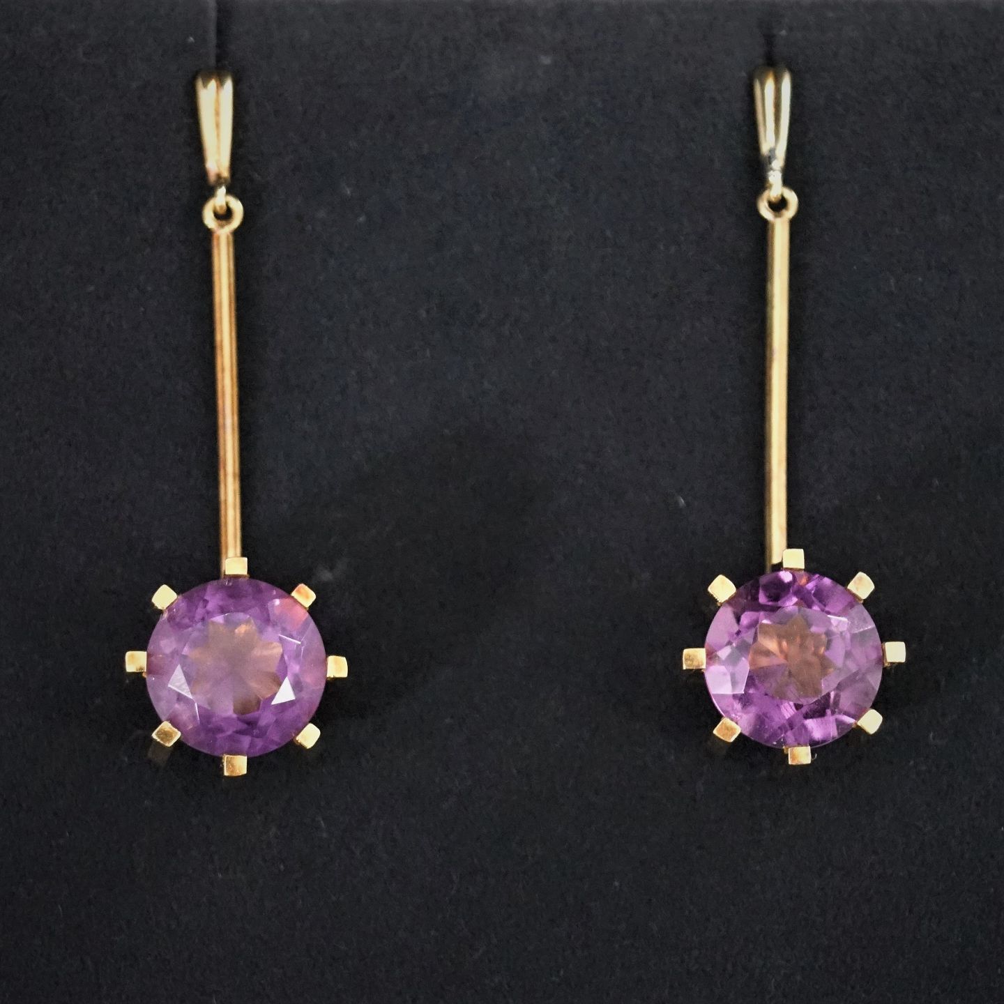 A pair of 14k gold earrings, set with an amethyst. L. 5 cm, b. 1,5 cm.