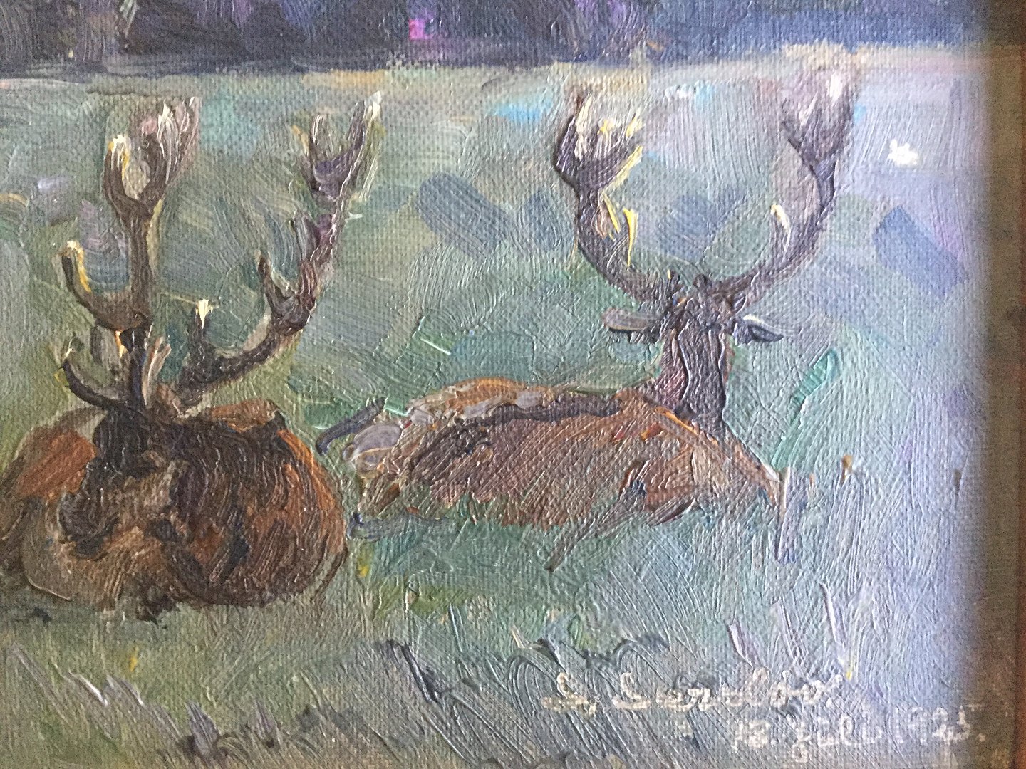 Maleri af Frederik Larsen-Særsløv 1925 - Hvilende Kronhjorte ved skov.