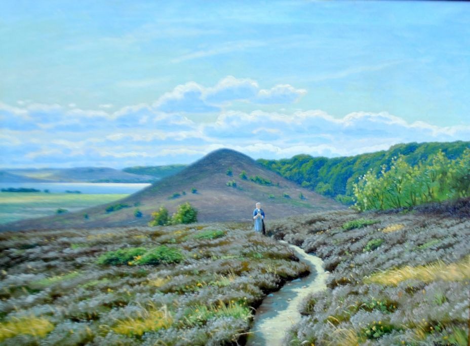 Thoring, H (Pseudonym for Kai Drews) (1884 - 1964) Danmark: En gående kvinde i lyngbakker. Olie på lærred. Signeret. 50 x 68 cm.