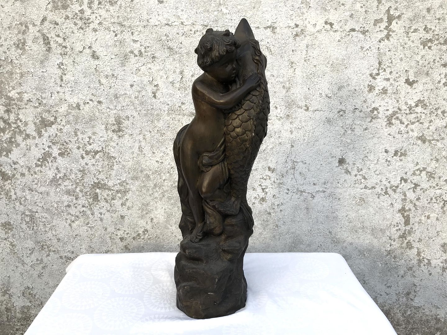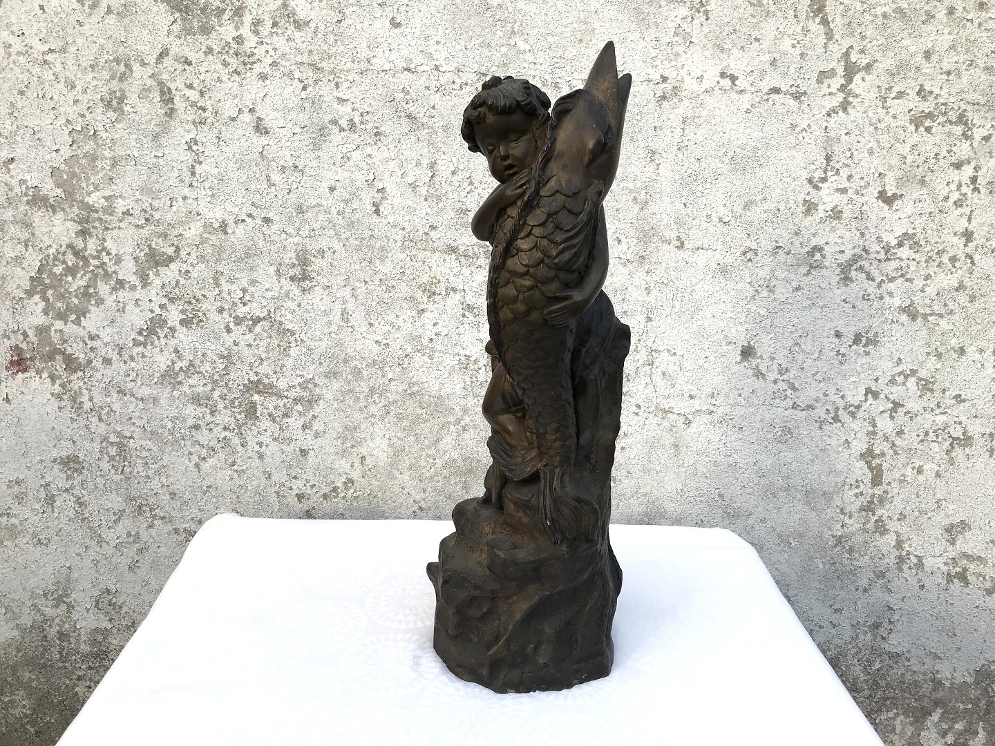 Bronze figure, Unsigned, child with fish, 49cm tall * Nice condition *