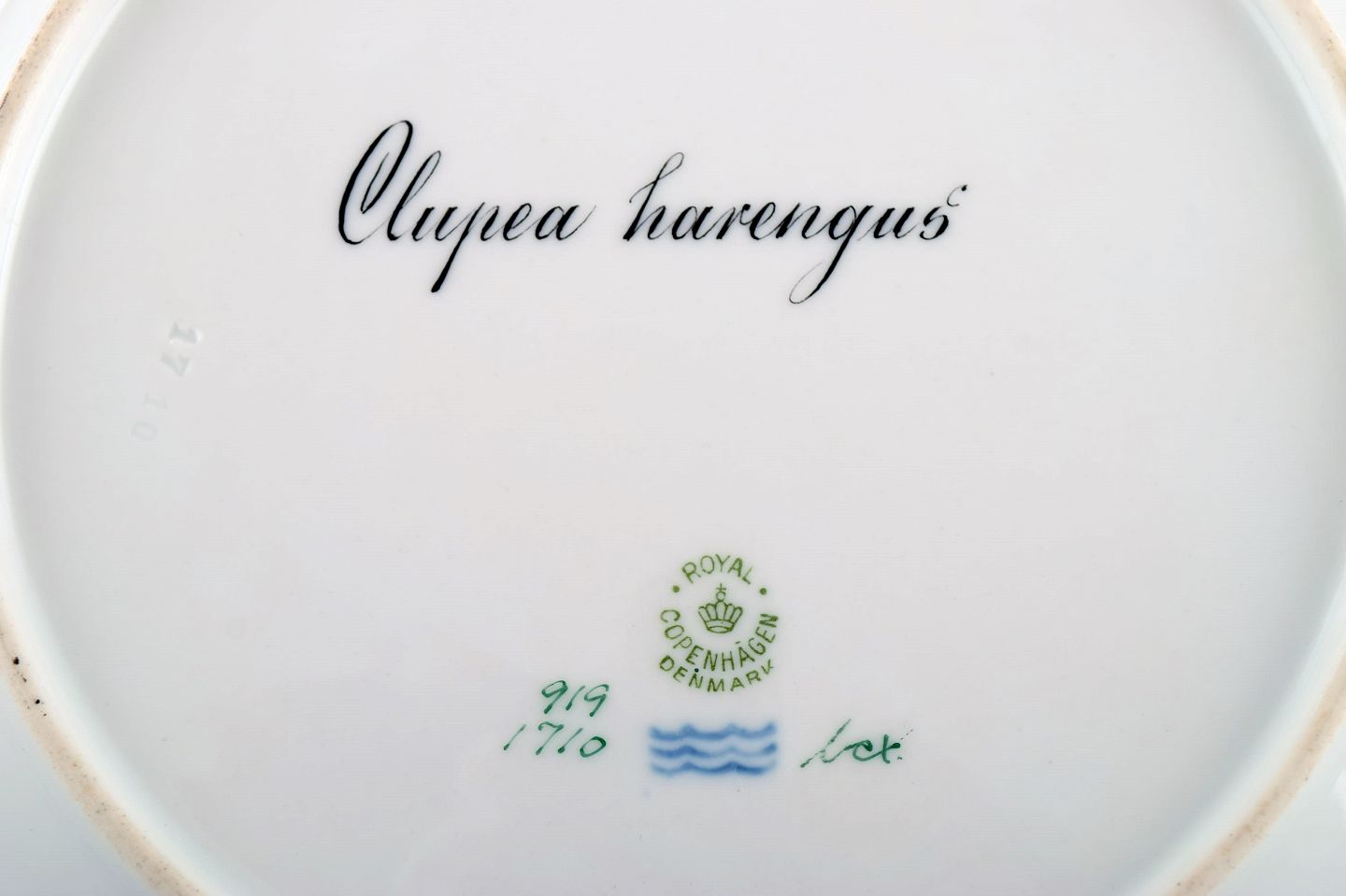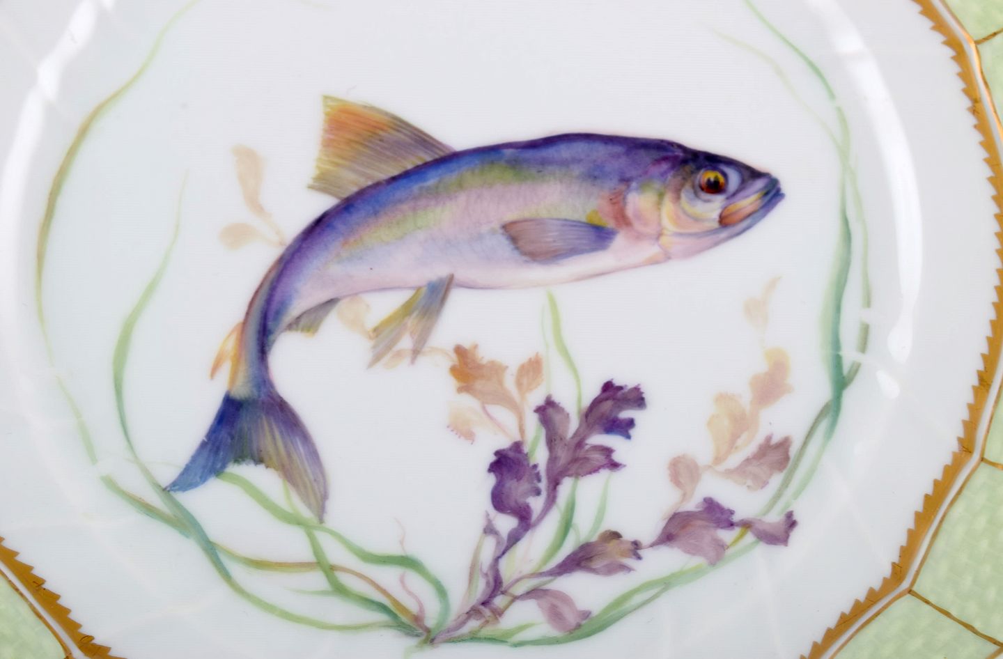 Royal Copenhagen fisketallerken med grøn kant, gulddekoration og fiskemotiv. Model 919/1710.