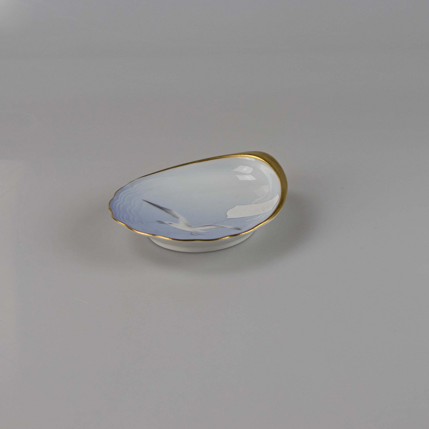Asiet fremstillet i porcelæn med skelform i gradueret blå nuancer med guldkant samt motiv af måge.
