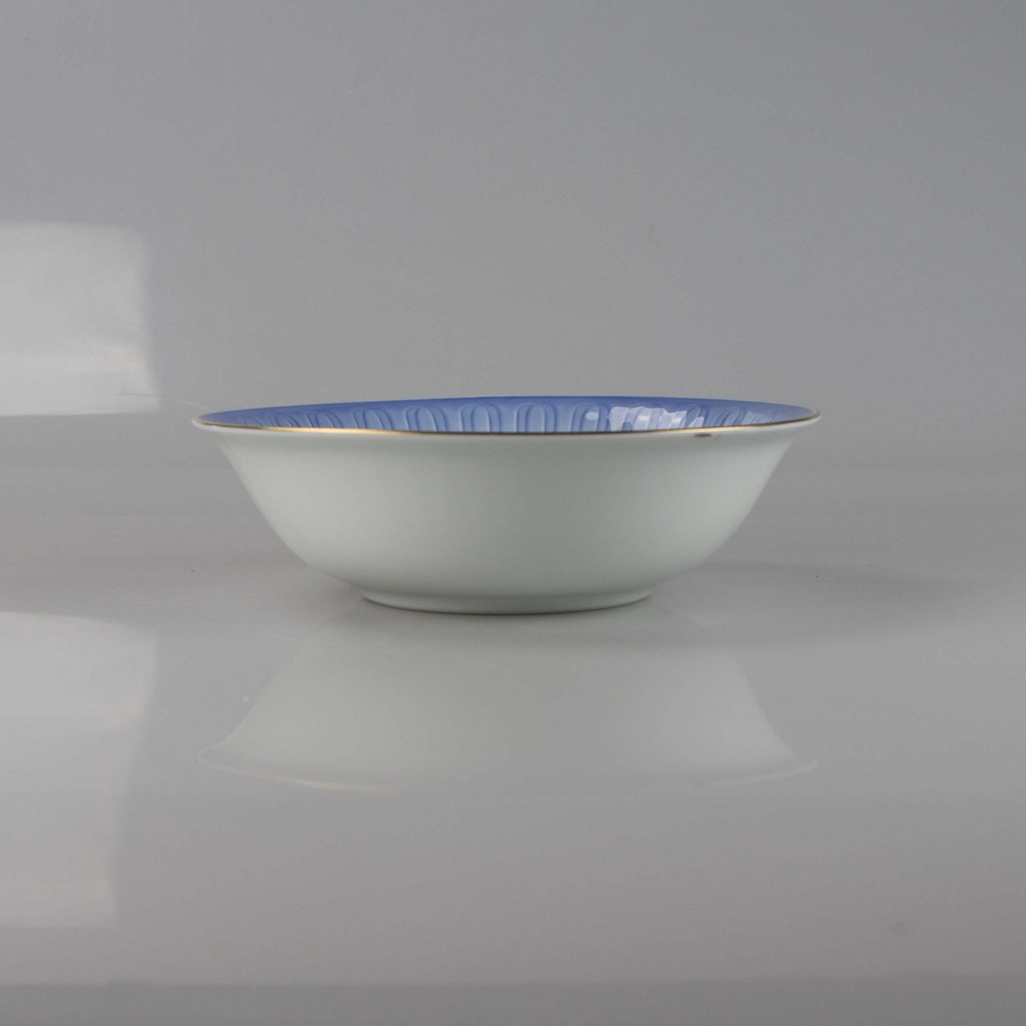 Skål fremstillet i porcelæn med stribet motiv i gradueret blå nuancer.