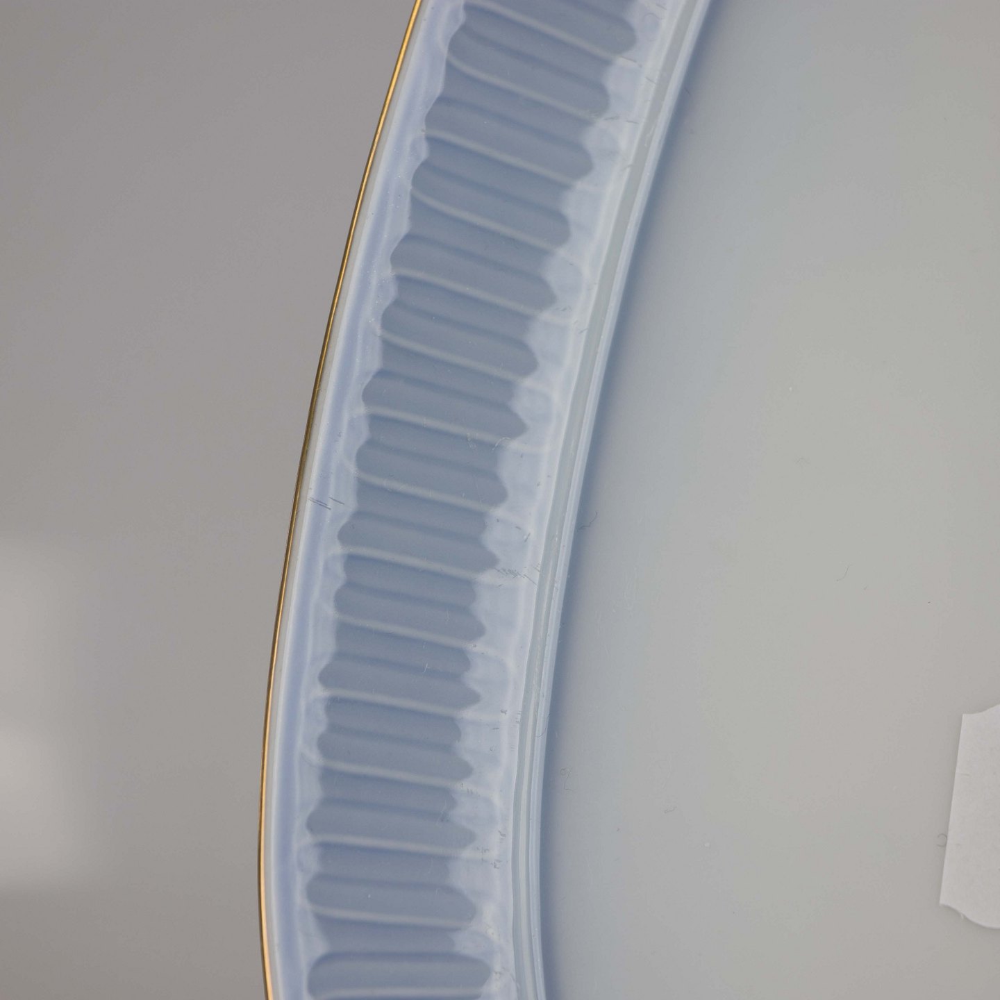 Fad fremstillet i porcelæn med stribet motiv i gradueret blå nuancer.