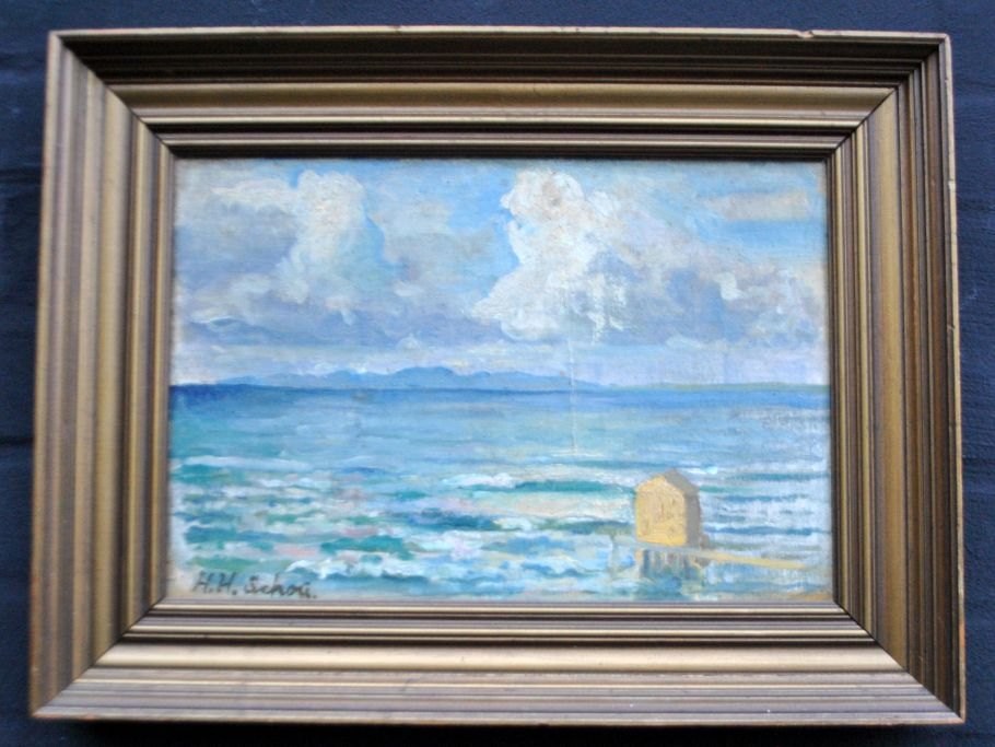 Schou, Hans Henrik (1884 - 1986) Danmark: Scene fra Øresund. Olie på lærred/træ. Signeret. 22,5 x 34 cm.
