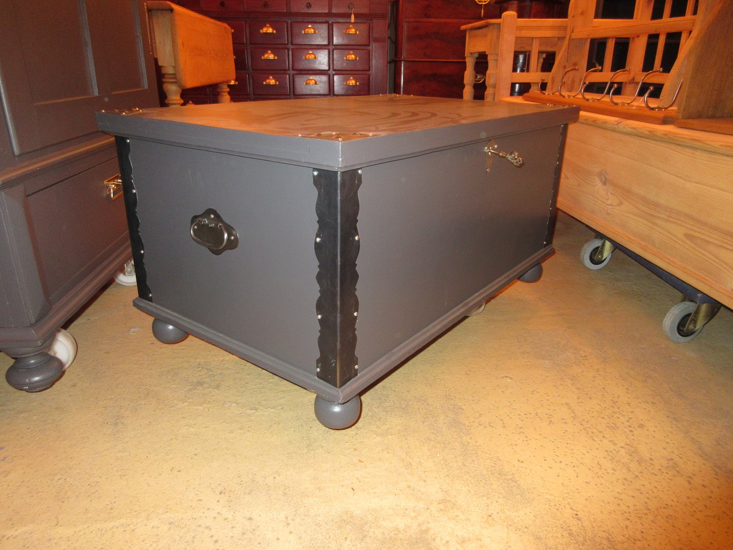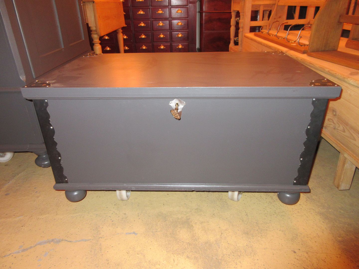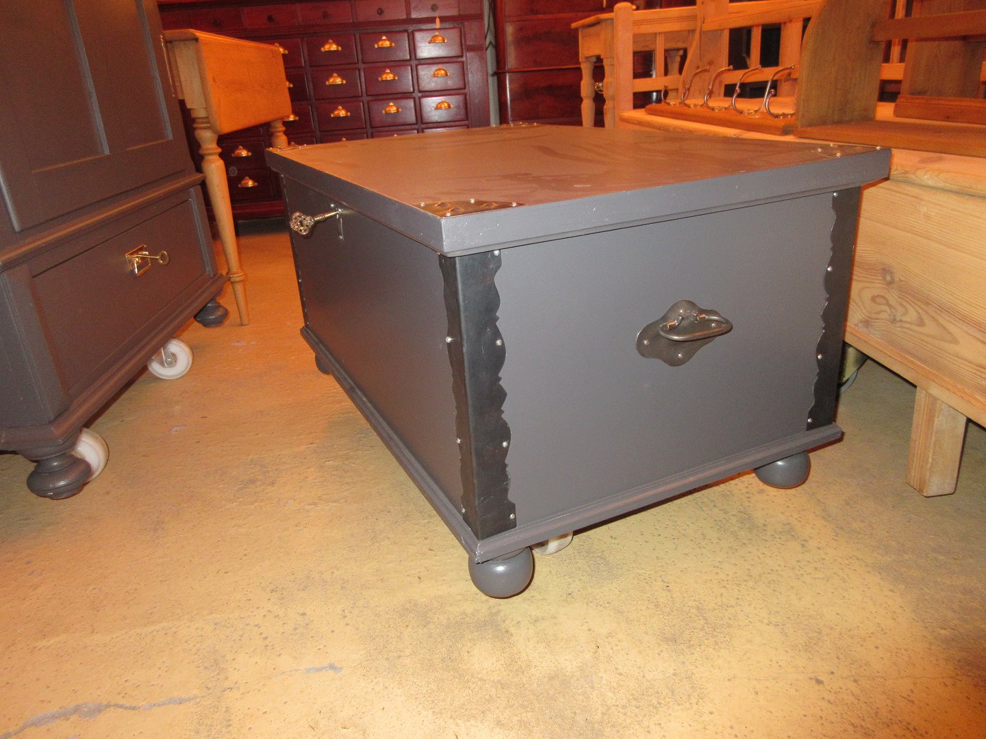 Kiste restaureret og malet grå, i fin stand Mål H 46, B 90, D 55,cm 524/28-P