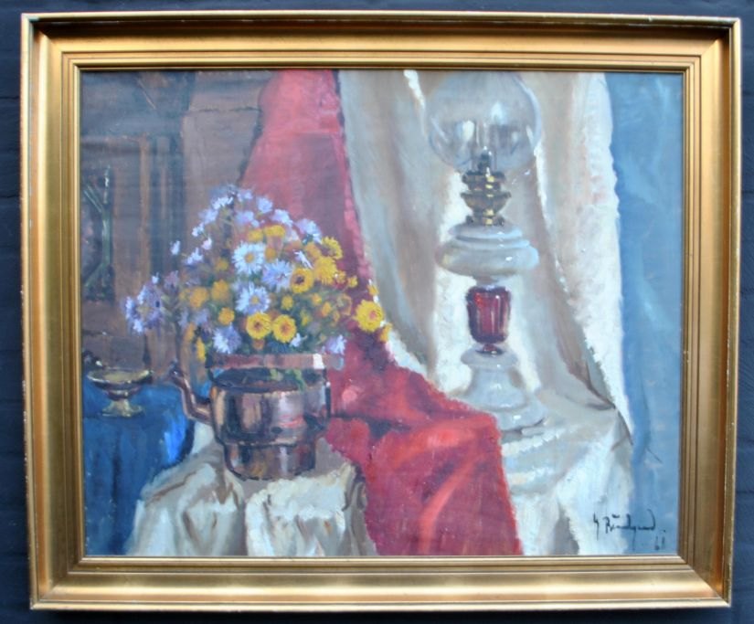 Bundgaard, Gunnar (1920 - 2005) Denmark: Arranging on a table. Oil on canvas. Signed 1961. 65 x 80 cm.
