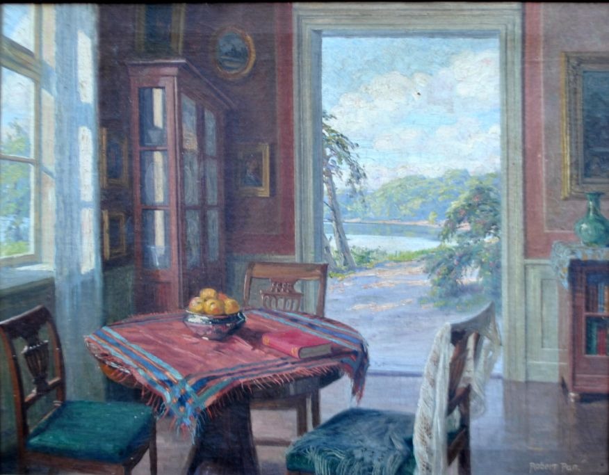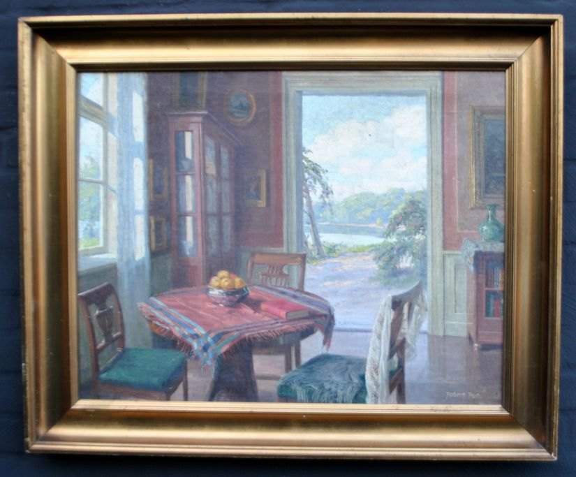 Panitzsch, Robert (1879 - 1949) Danmark: Interiør fra en solbeskinnet stue. Olie på lærred. Signeret: Pobert Pan. 56 x 70 cm.