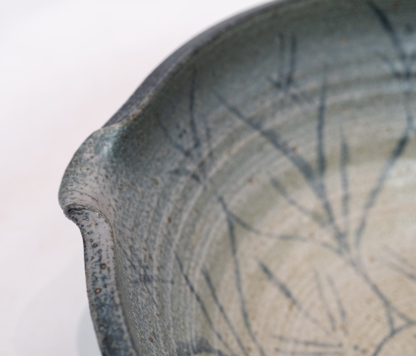 Stor grå keramik skål dekoreret med mønster indvendigt af Weiss.