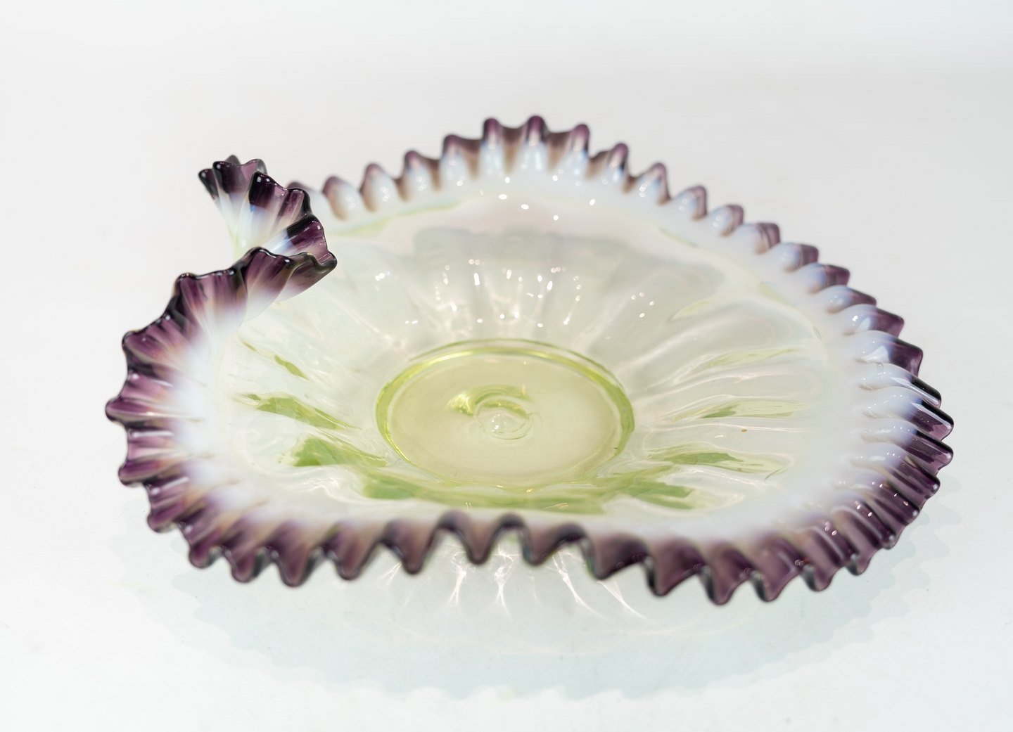 Bowl of opaline glass in great design with yellow and purple colours from the 1890s.